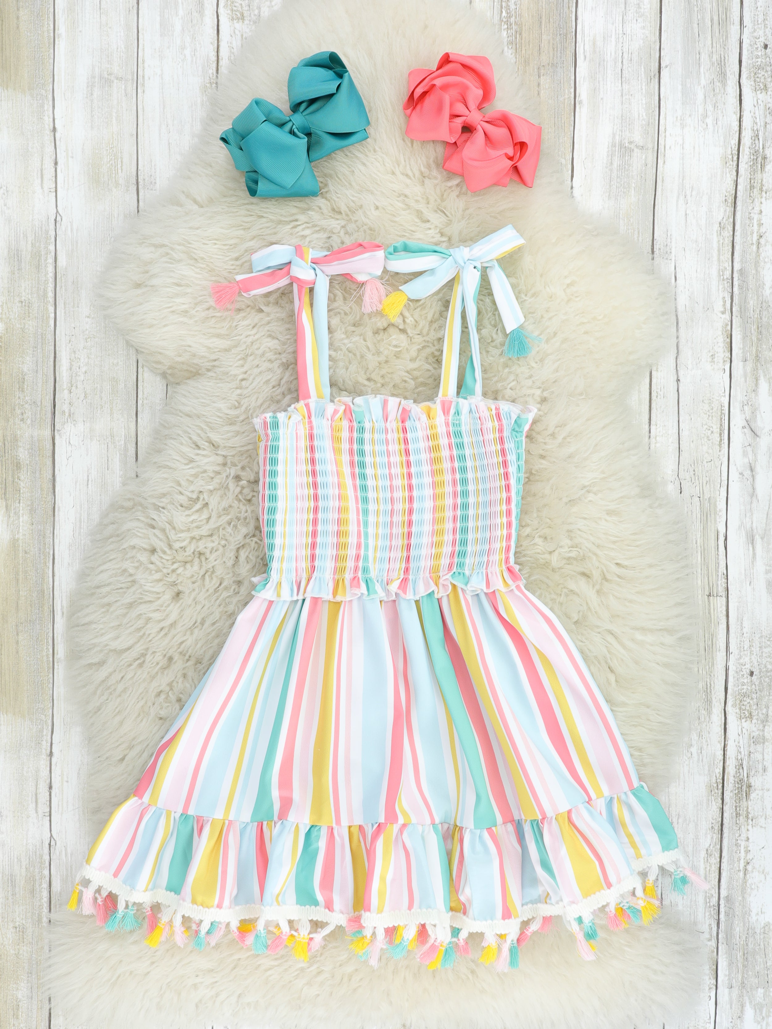 This sweet spring set is perfect for a beach day! This dress features smocking, gorgeous spring stripes, ruffle trim, & adjustable tie straps.