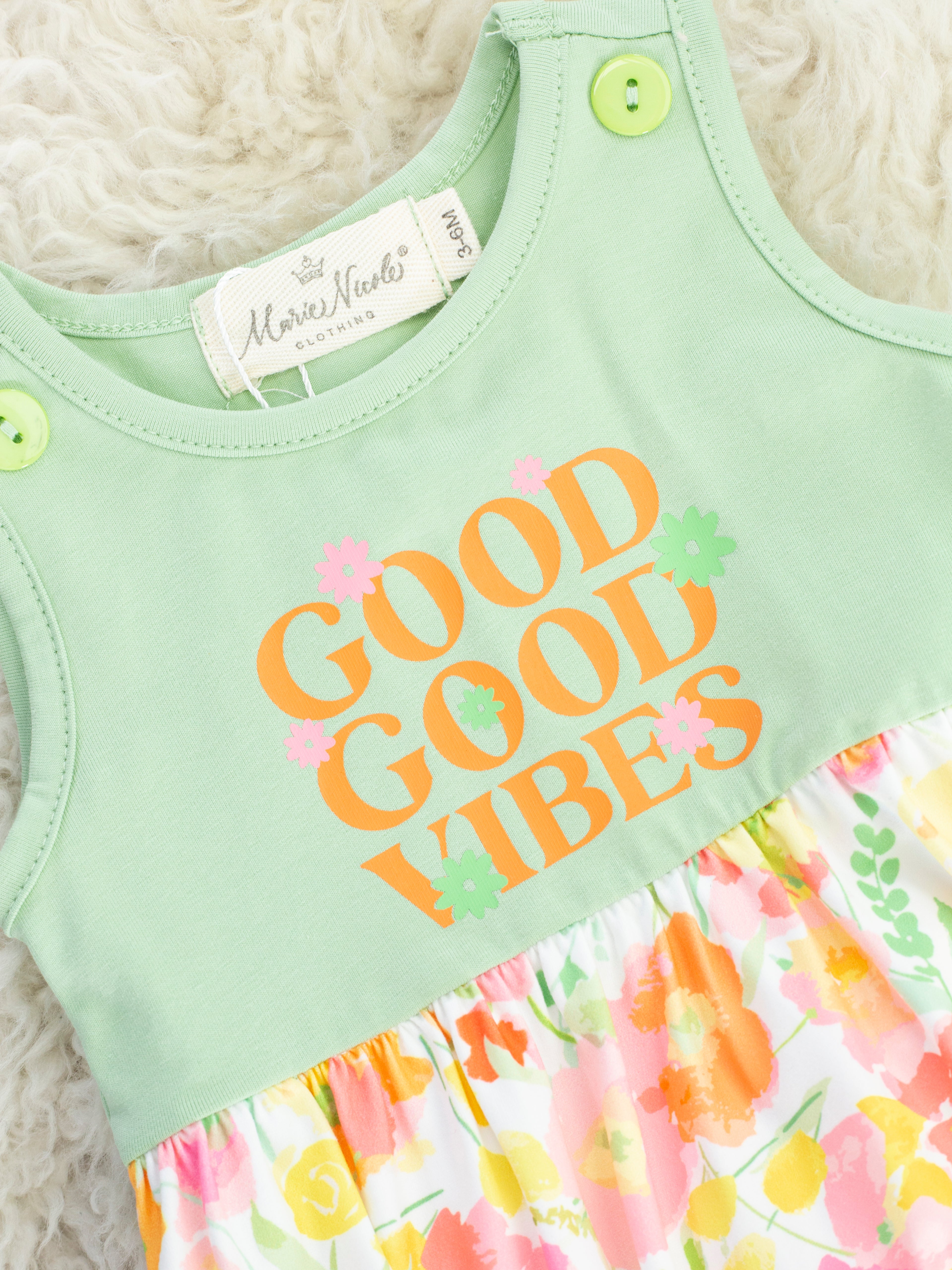 The perfect sister set for your girls who give off the best vibes! This sage bubble features a ruffle butt, a "Good Good Vibes" detail, stunning florals, & functioning buttons on the straps.