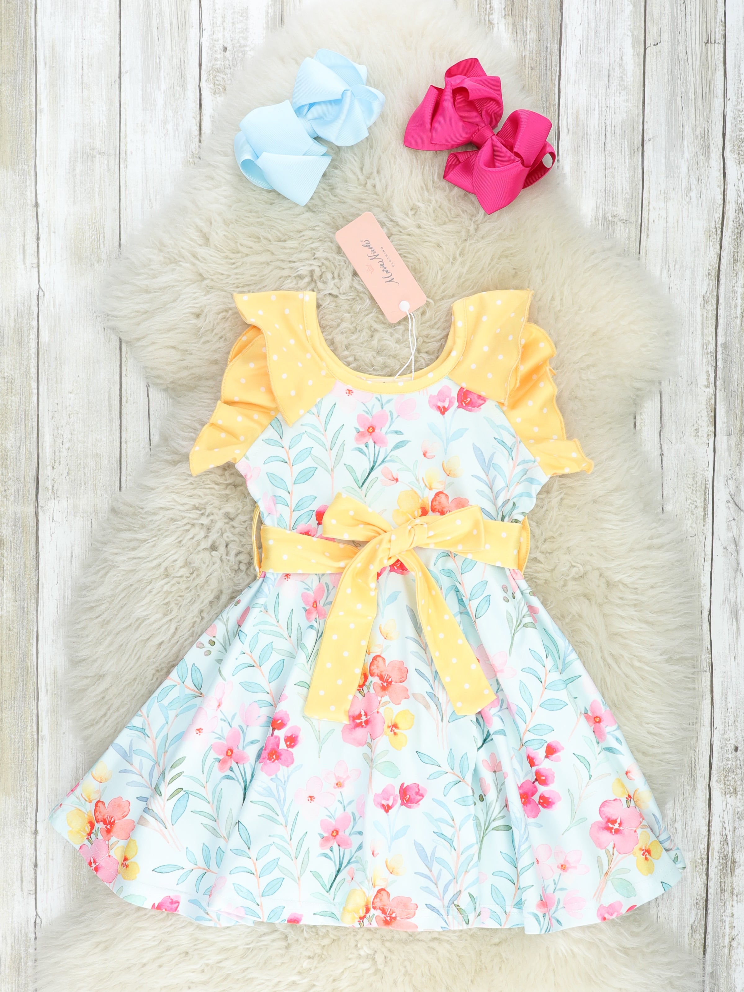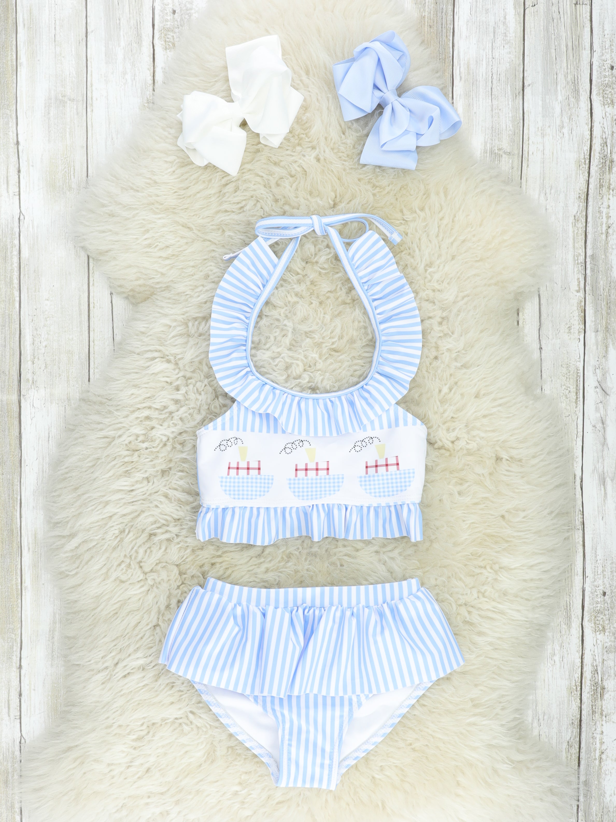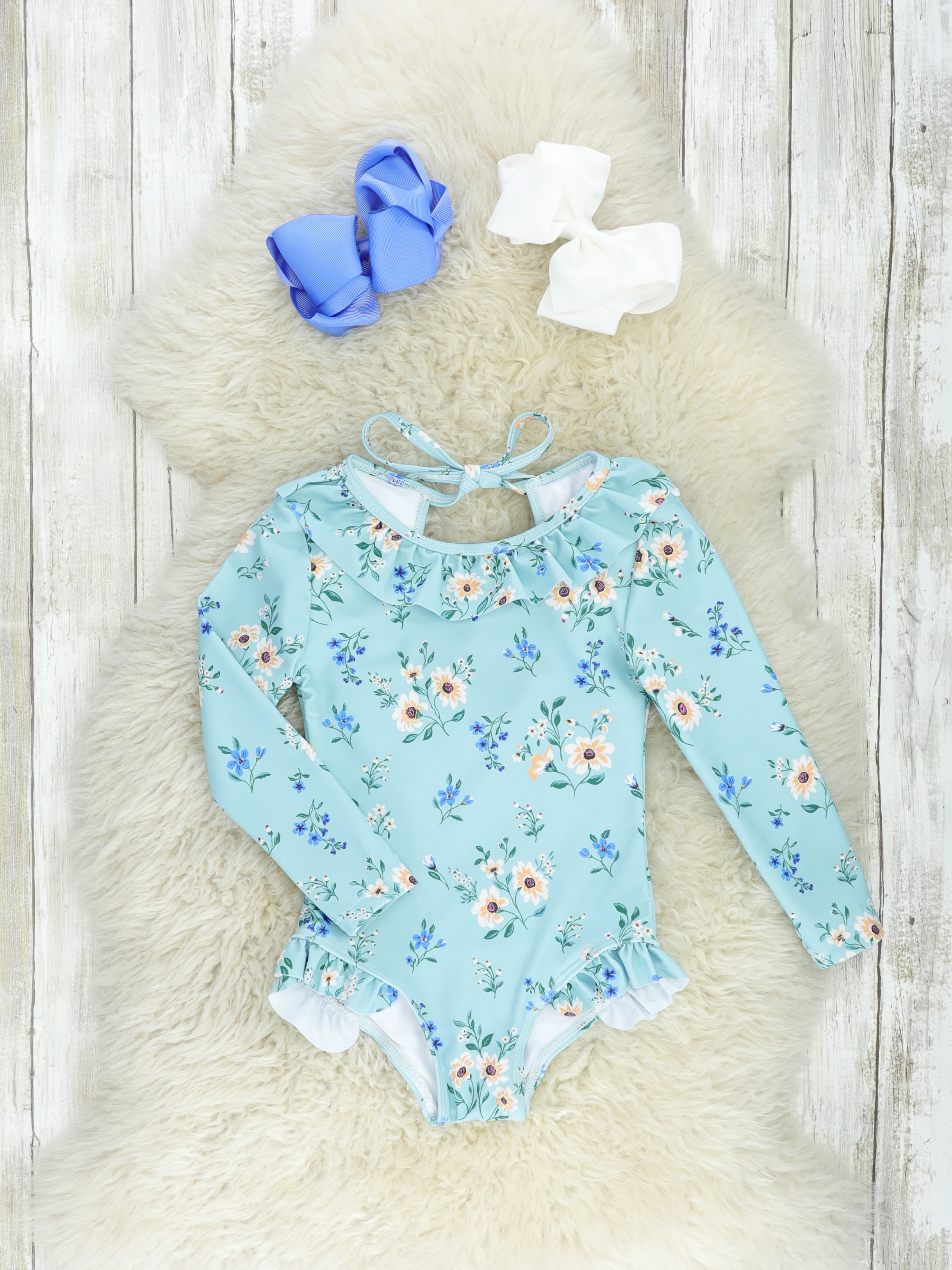 Sky Blue Floral Ruffle Rash Guard Swimsuit