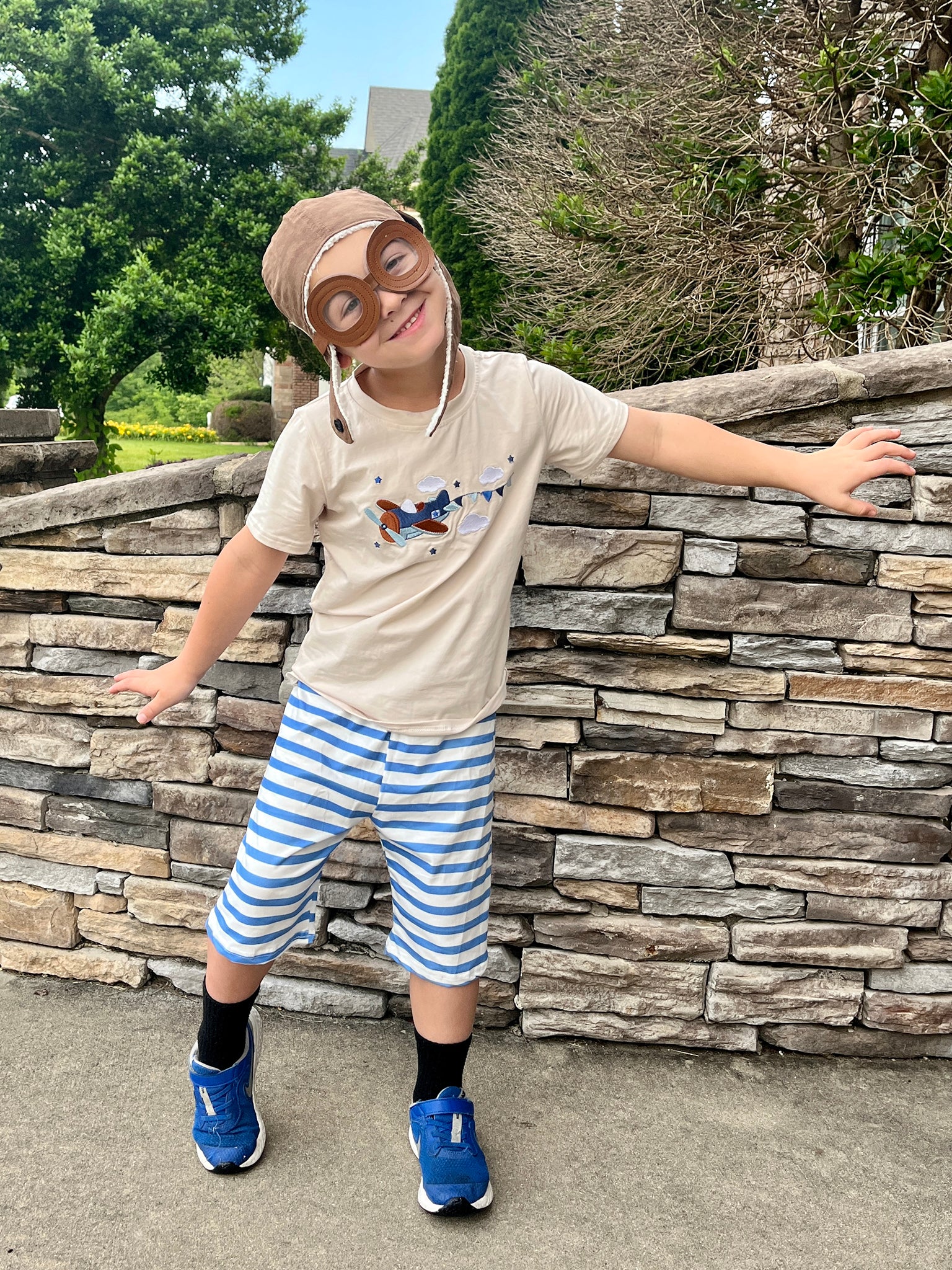 Dress your tiny aviator in style with our Airplane Striped Outfit! The top is tan with a charming airplane detail, paired with navy and white striped shorts featuring an elastic waistband for ease of wear. Your tyke will soar in comfort and style!