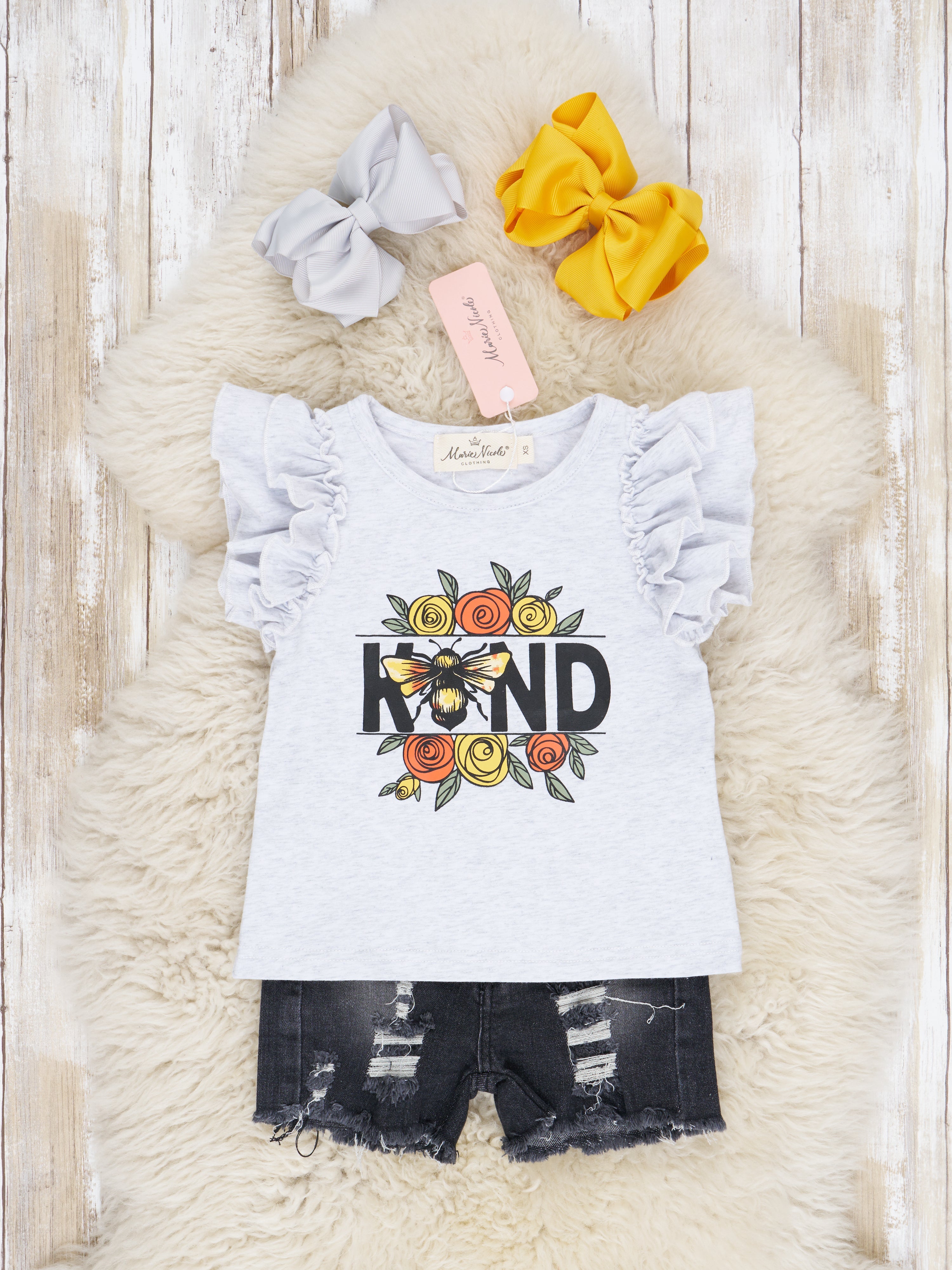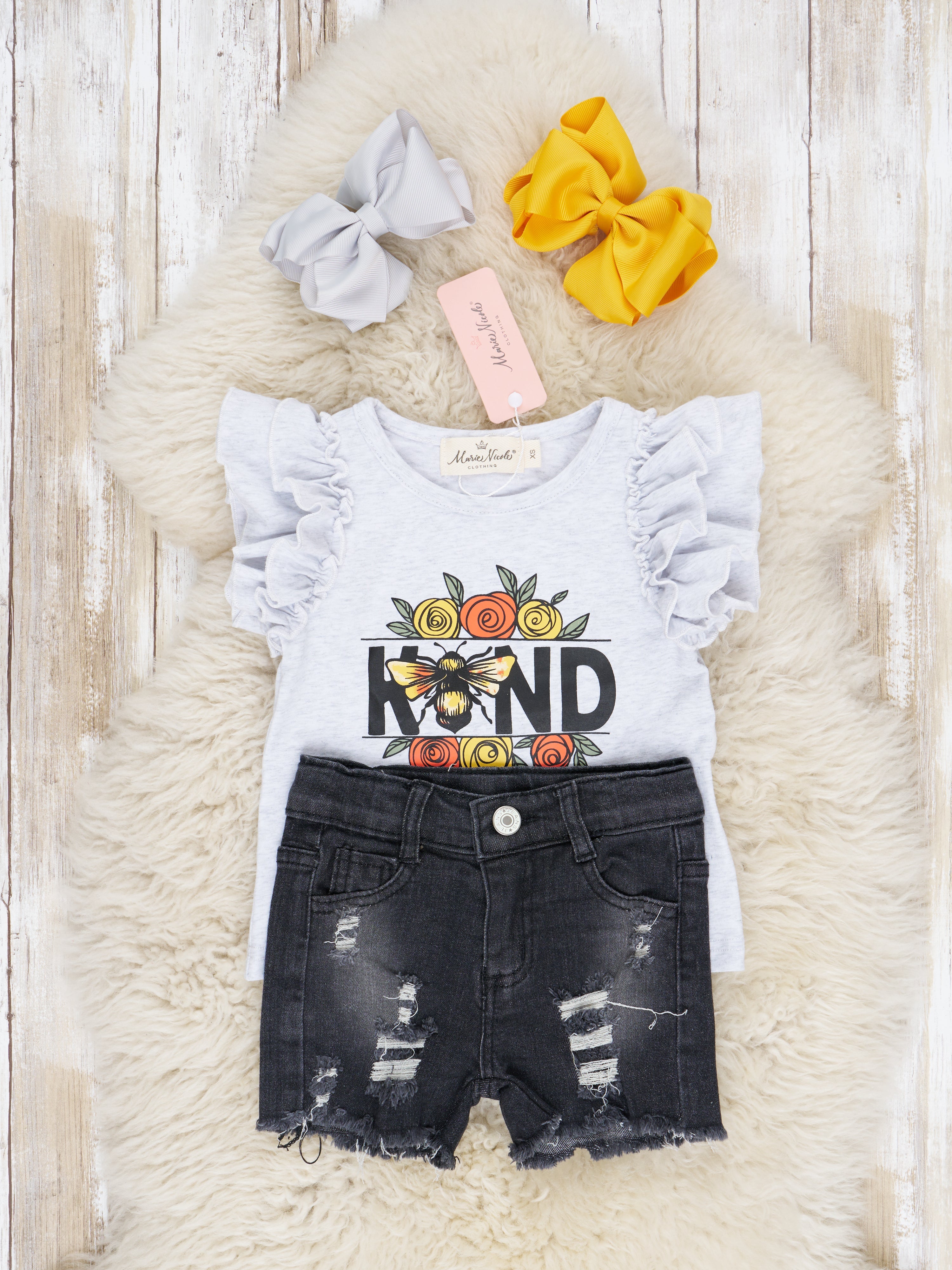 Bring a little bit of buzz to your gals wardrobe with this fun "Kind" Bee Ruffle Top & Denim Shorts Outfit. Featuring all-day comfort, with ruffle sleeves and a "kind" bee detail. Plus, a pair of black denim shorts to complete the look. Make a statement and bee kind!