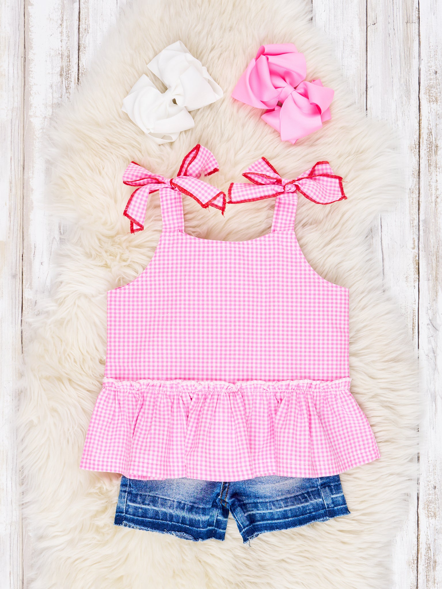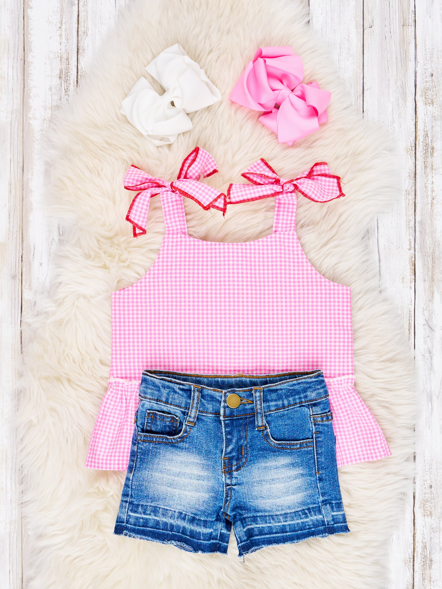 This look is great for adding a playful punch of pink to your child's wardrobe! Featuring a gingham tank with sweet bow details and denim shorts, they'll be looking stylish and comfy all day!