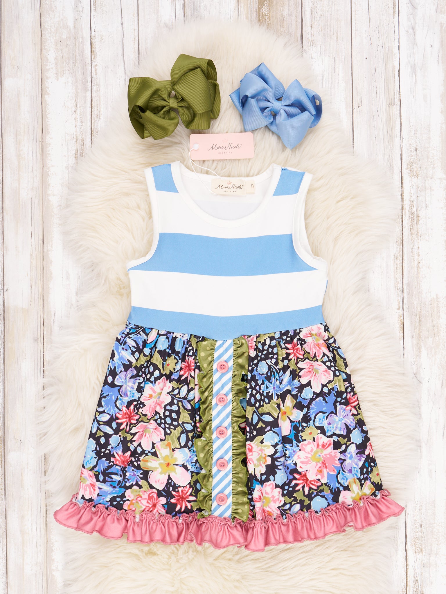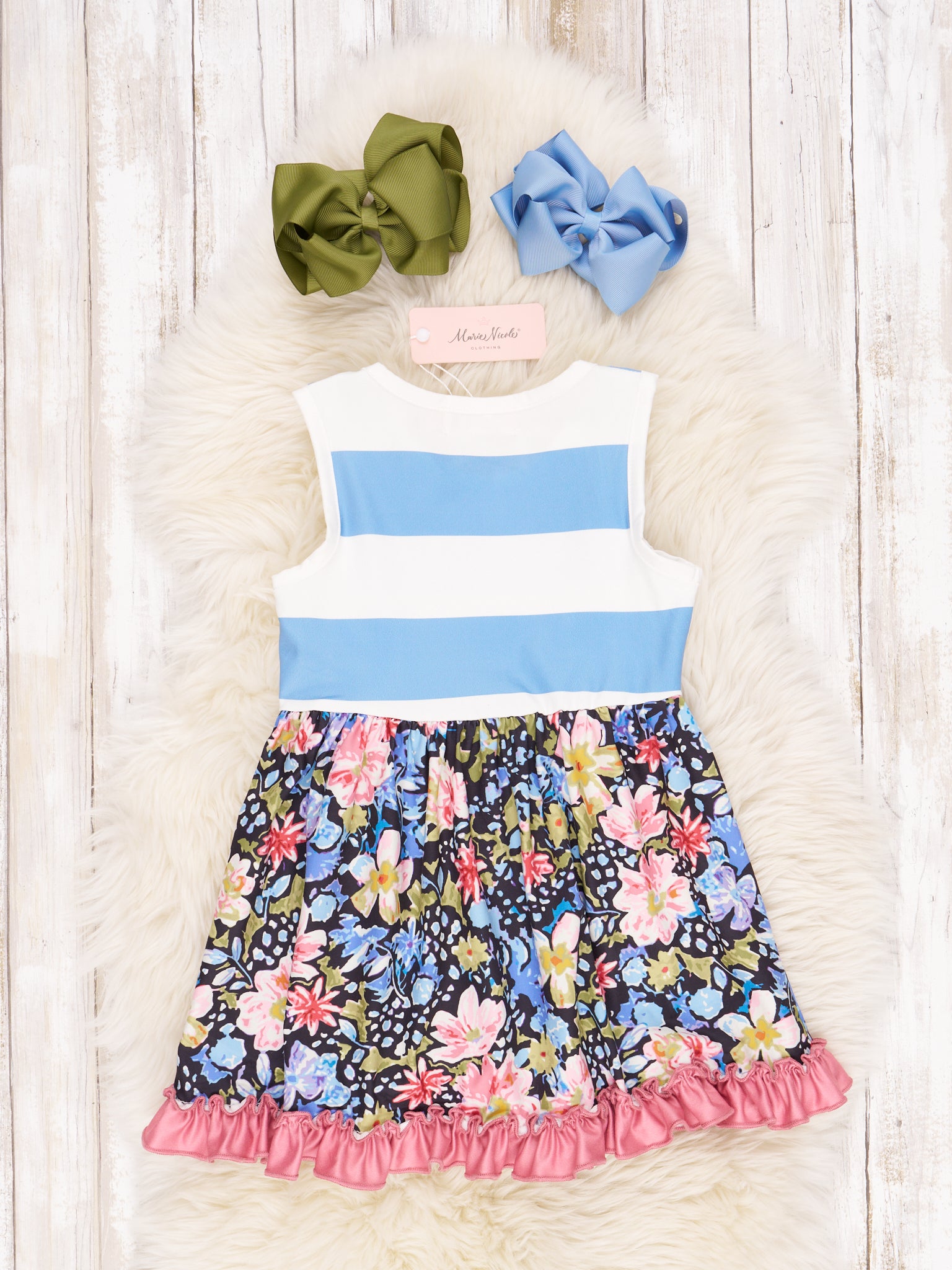 Get your little one ready for a playdate in style with this Blue Floral Striped Ruffle Dress! Featuring a colorful array of blue stripes and florals, plus an extra dose of flair with the ruffles, it's the perfect look for a fun day out.