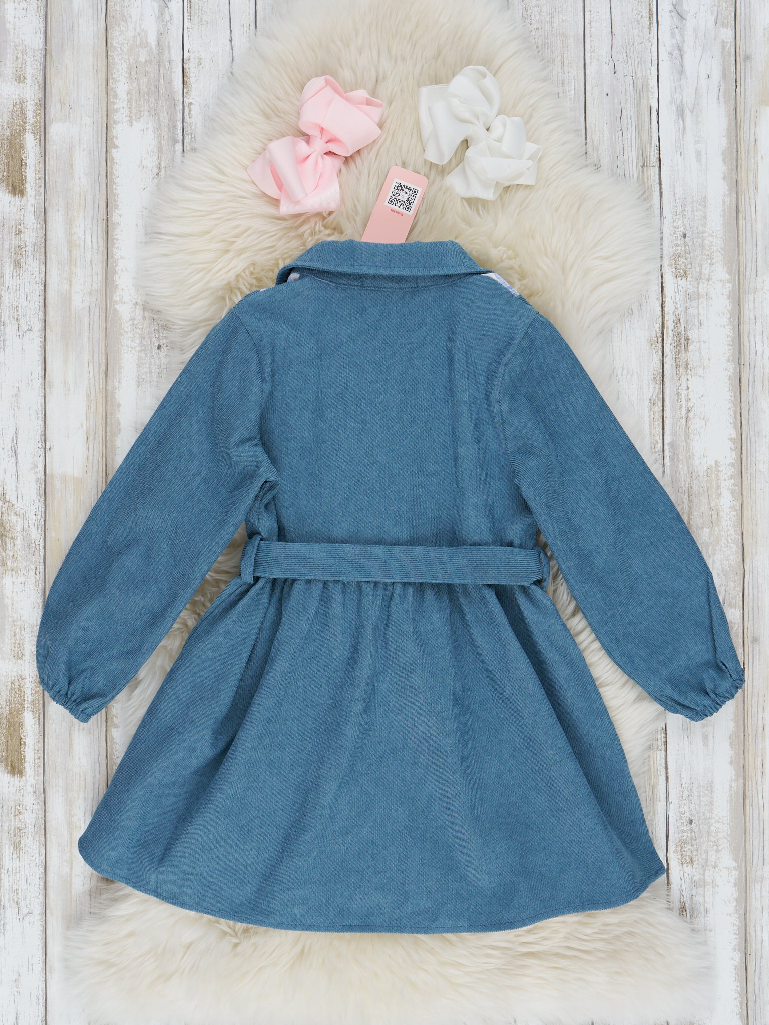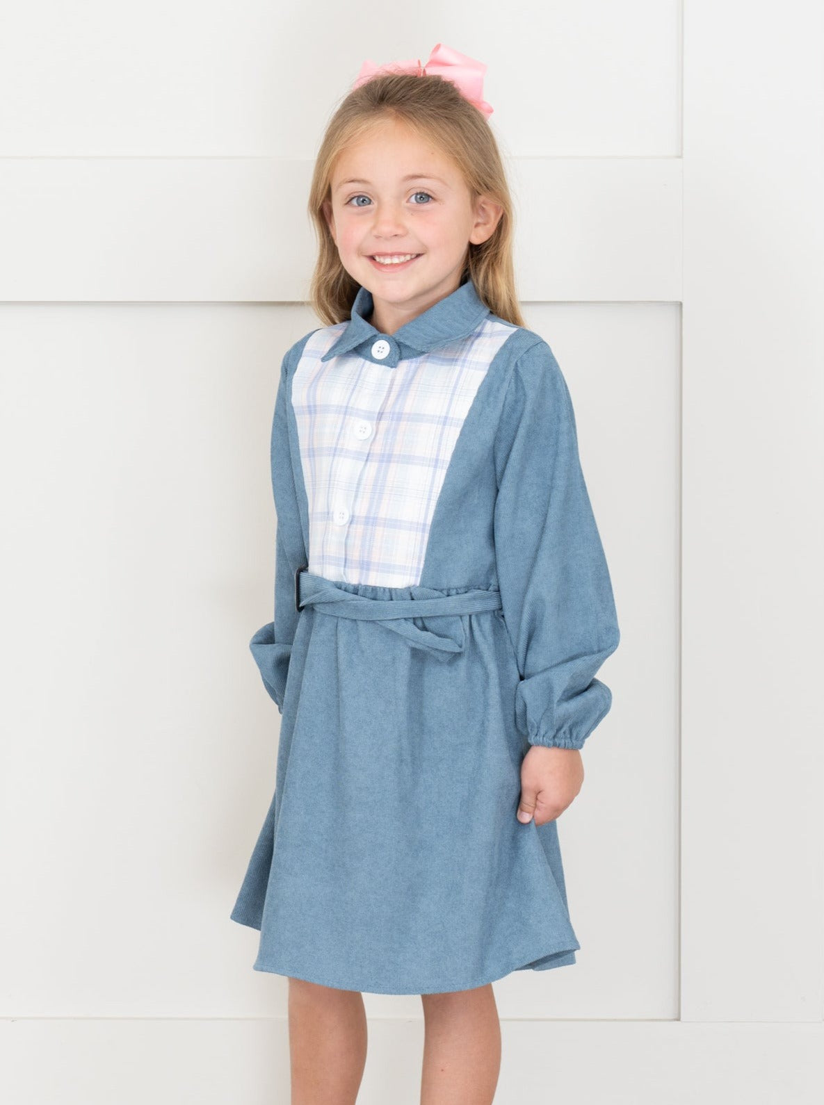 This classic dress features plaid detail with buttons on the chest, a belt around the waist, and cinched sleeves.