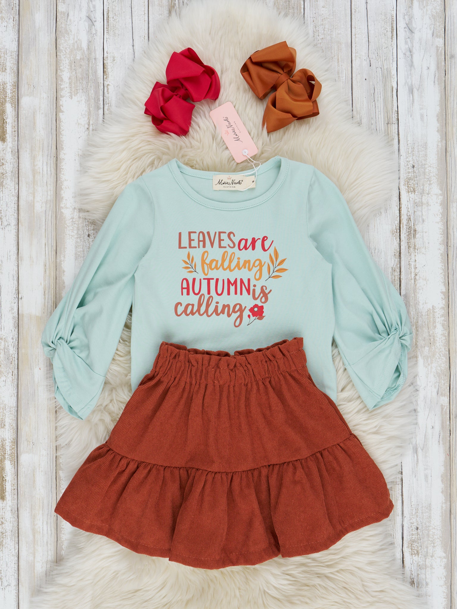 Your little one will be ready for the changing leaves in this adorable outfit featuring mint crewneck top with scrunched sleeves and coordinating brown tiered skirt.