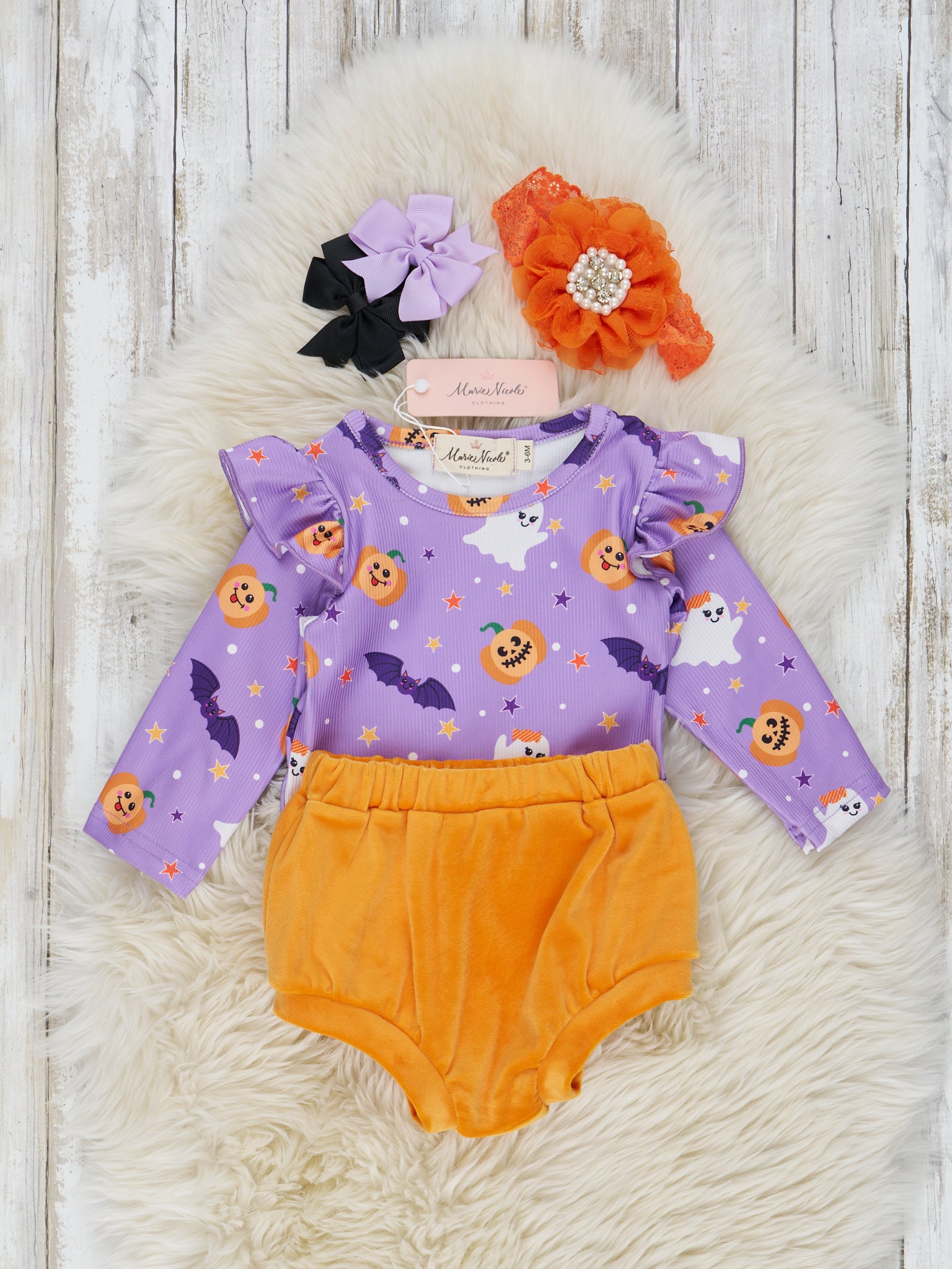 This sweet and sassy outfit features a purple ruffle shoulder long sleeve top with spooky bats, ghosts & pumpkins + coordinating orange velvet bloomers to create the perfect Halloween look!