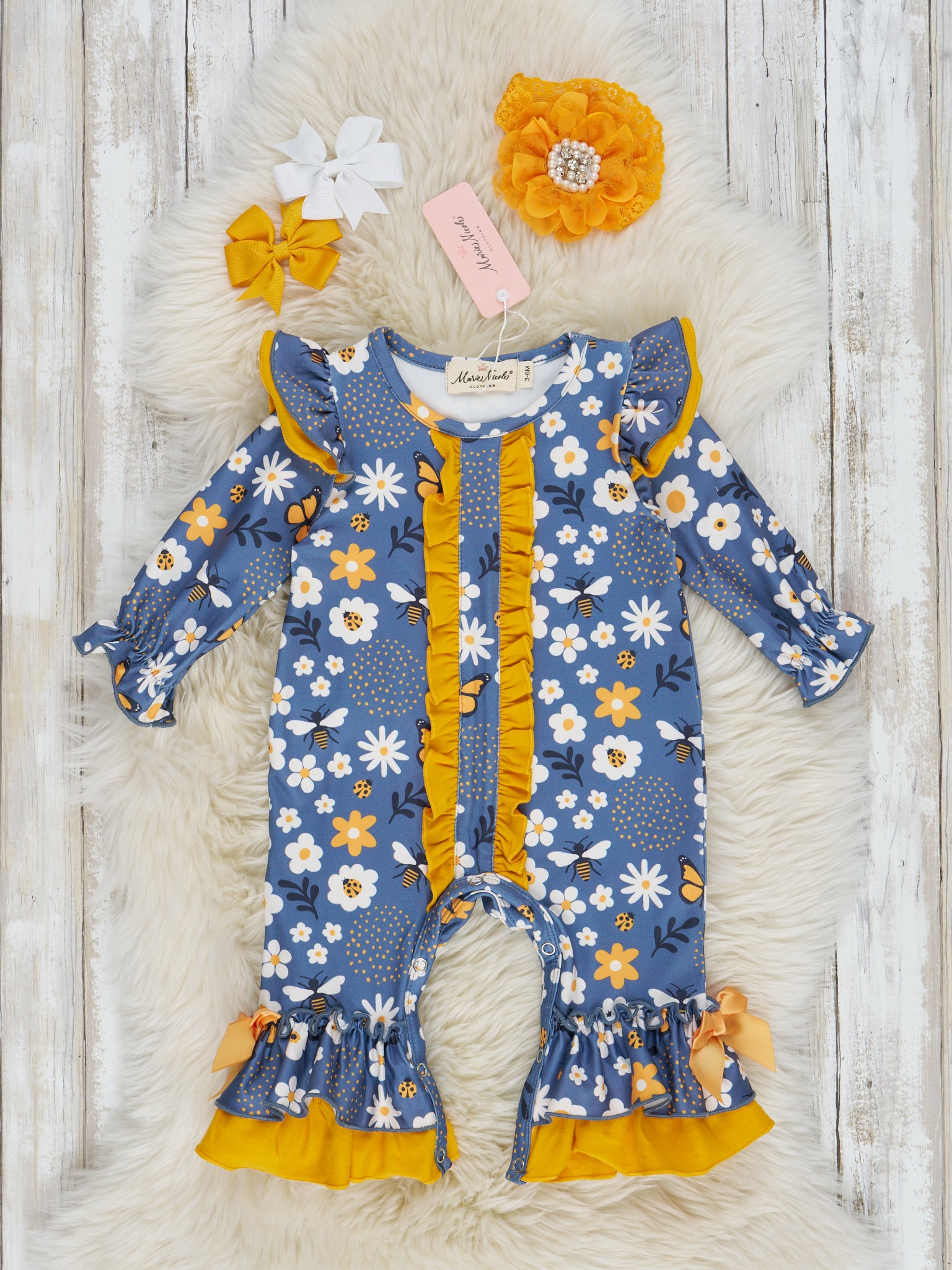 Blue & White Bee Floral Ruffle Romper