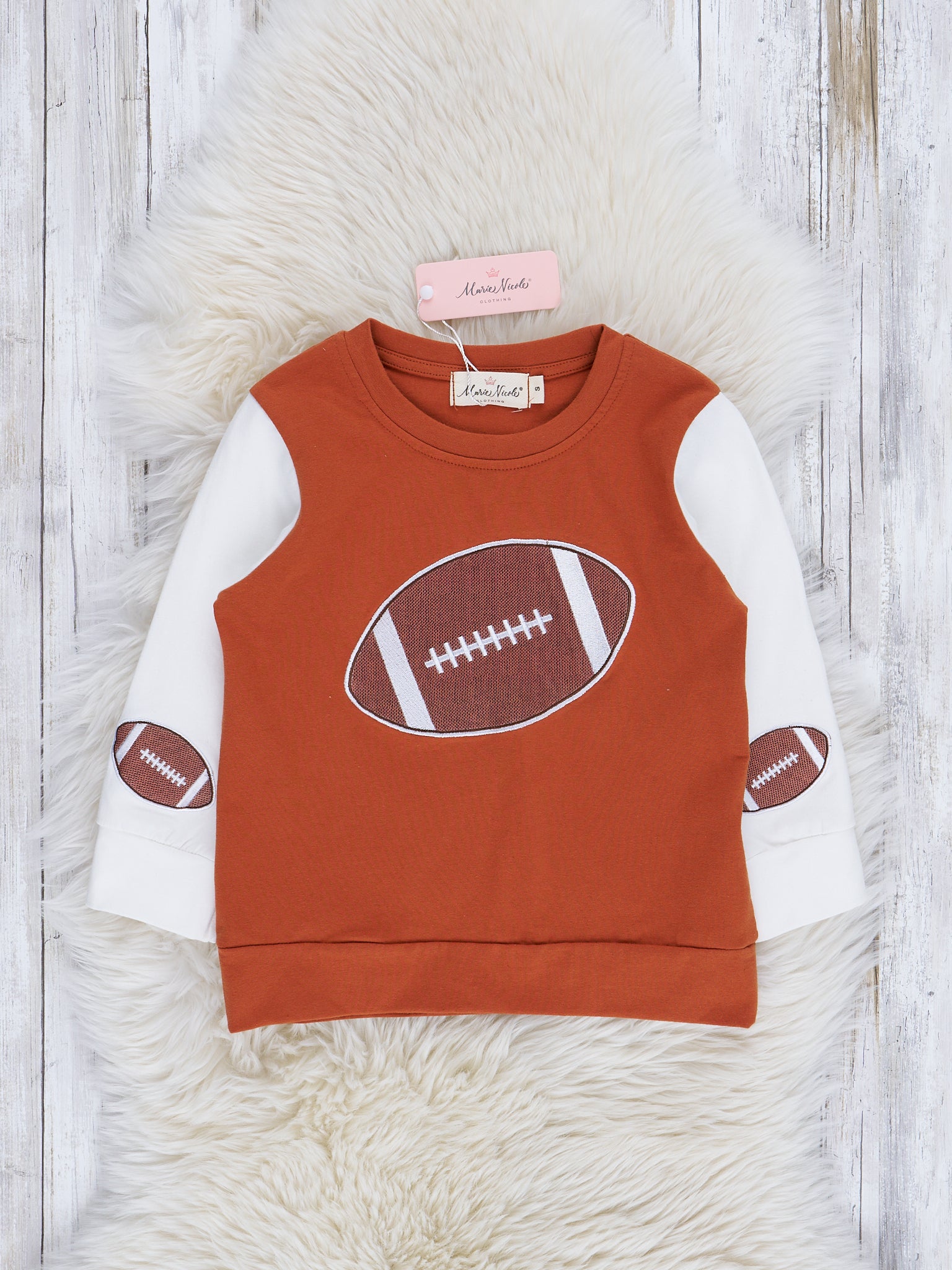Earn the extra point with this brother set! š This adorable top features white raglan long sleeves with embroidered footballs at the sleeves and chest.