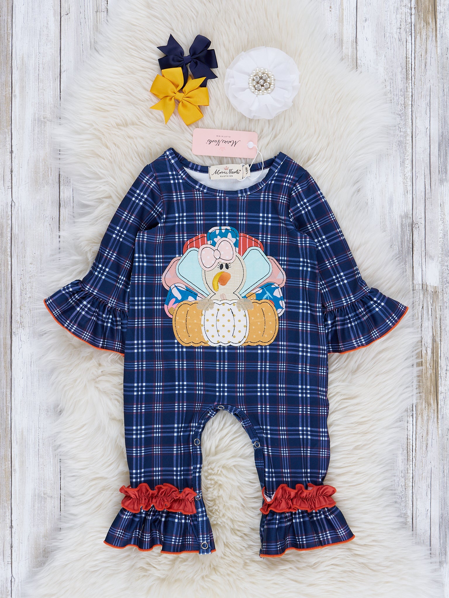 Blue & Orange Plaid Embroidered Turkey Ruffle Romper