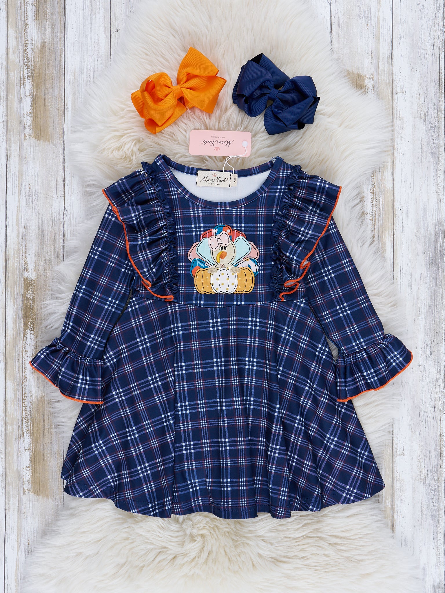 Blue & Orange Plaid Embroidered Turkey Ruffle Dress