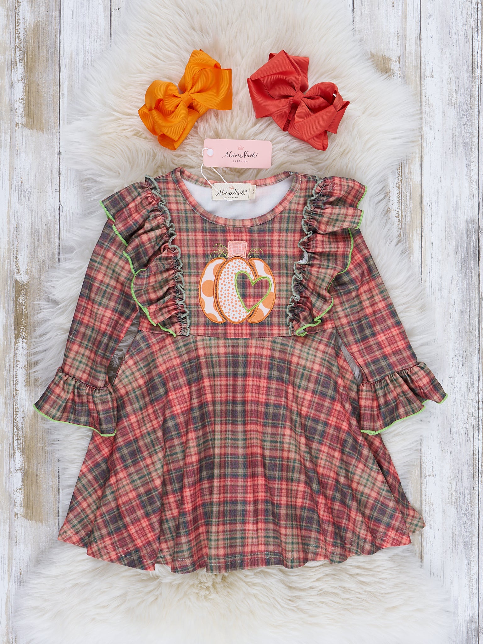 Lime & Brown Plaid Embroidered Pumpkin Ruffle Dress