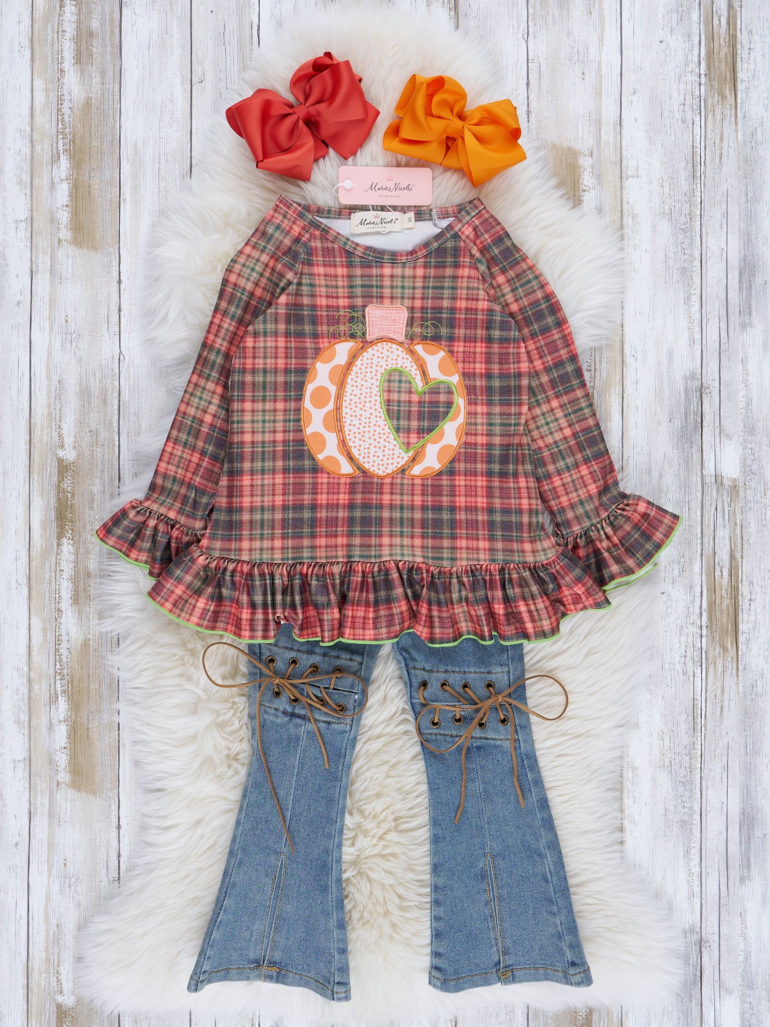 Lime & Brown Plaid Embroidered Pumpkin Outfit w/ Denim