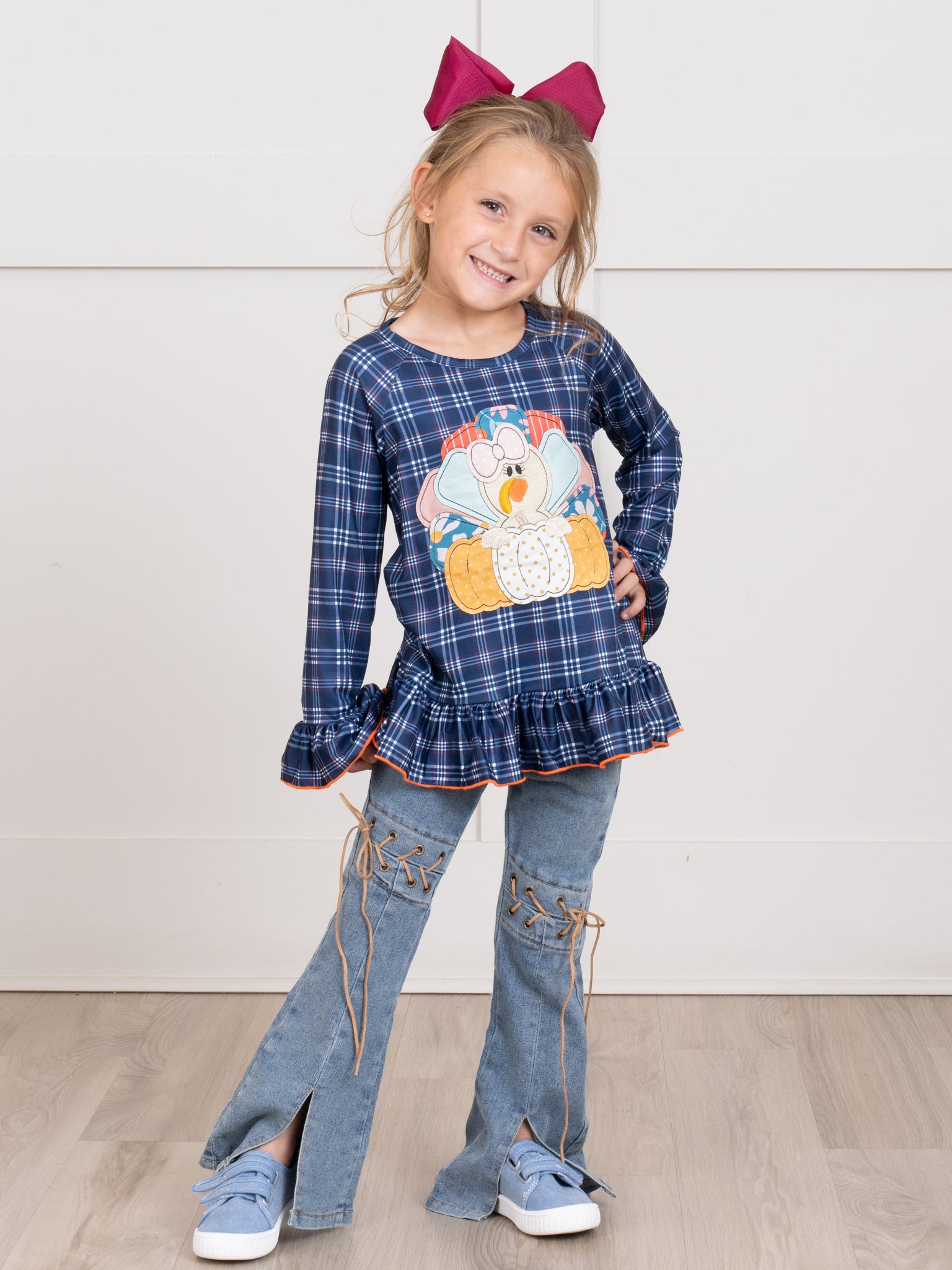 Blue & Orange Plaid Embroidered Turkey Outfit w/ Denim