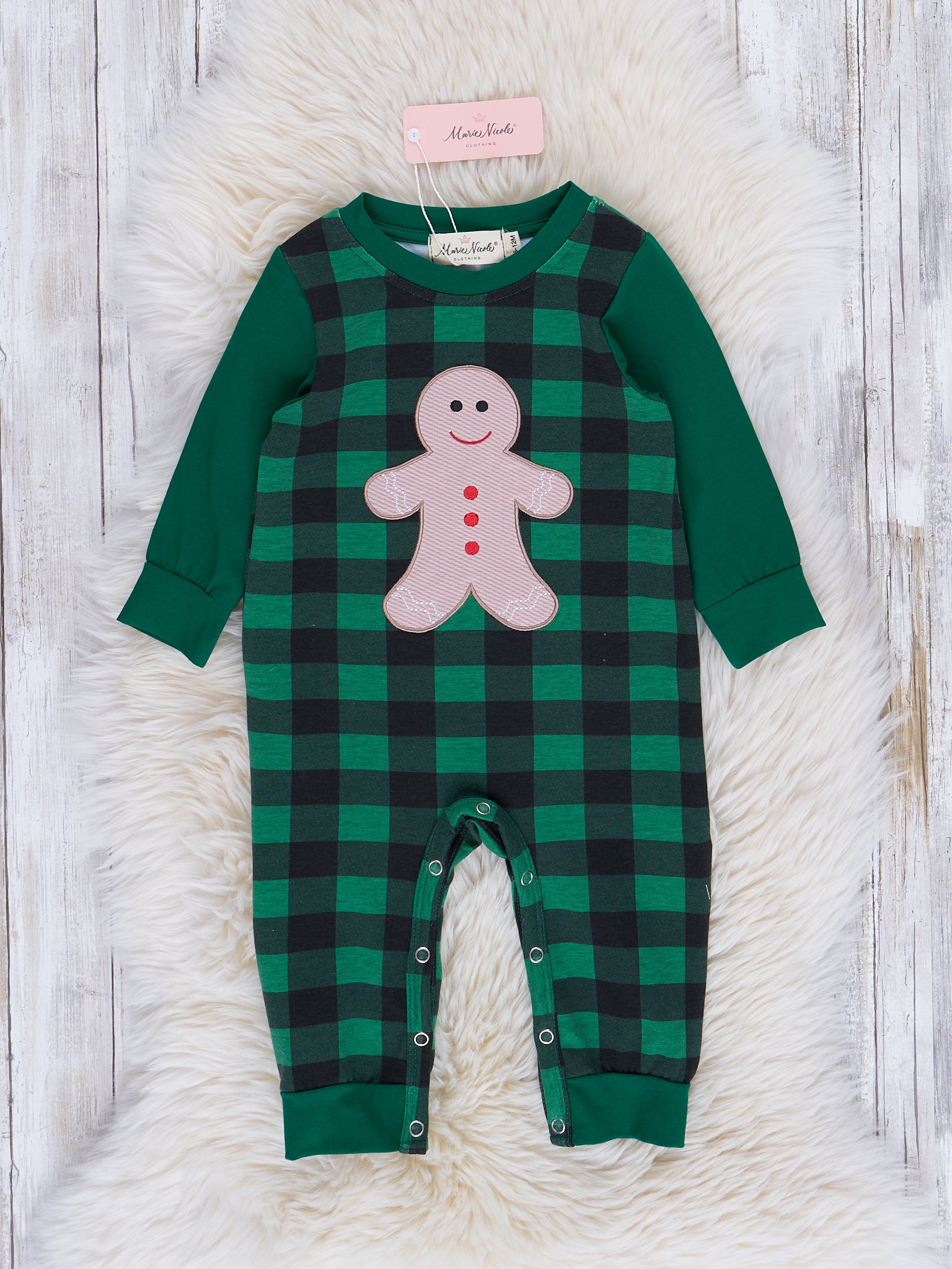 Green Buffalo Plaid Embroidered Gingerbread Romper