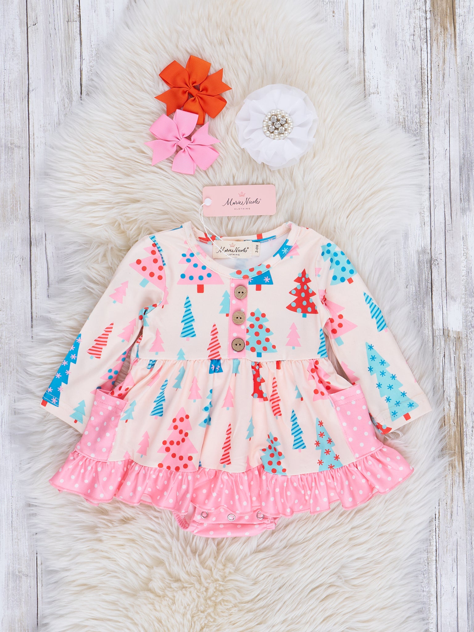 Pink Polka Dot Whimsical Trees Ruffle Romper