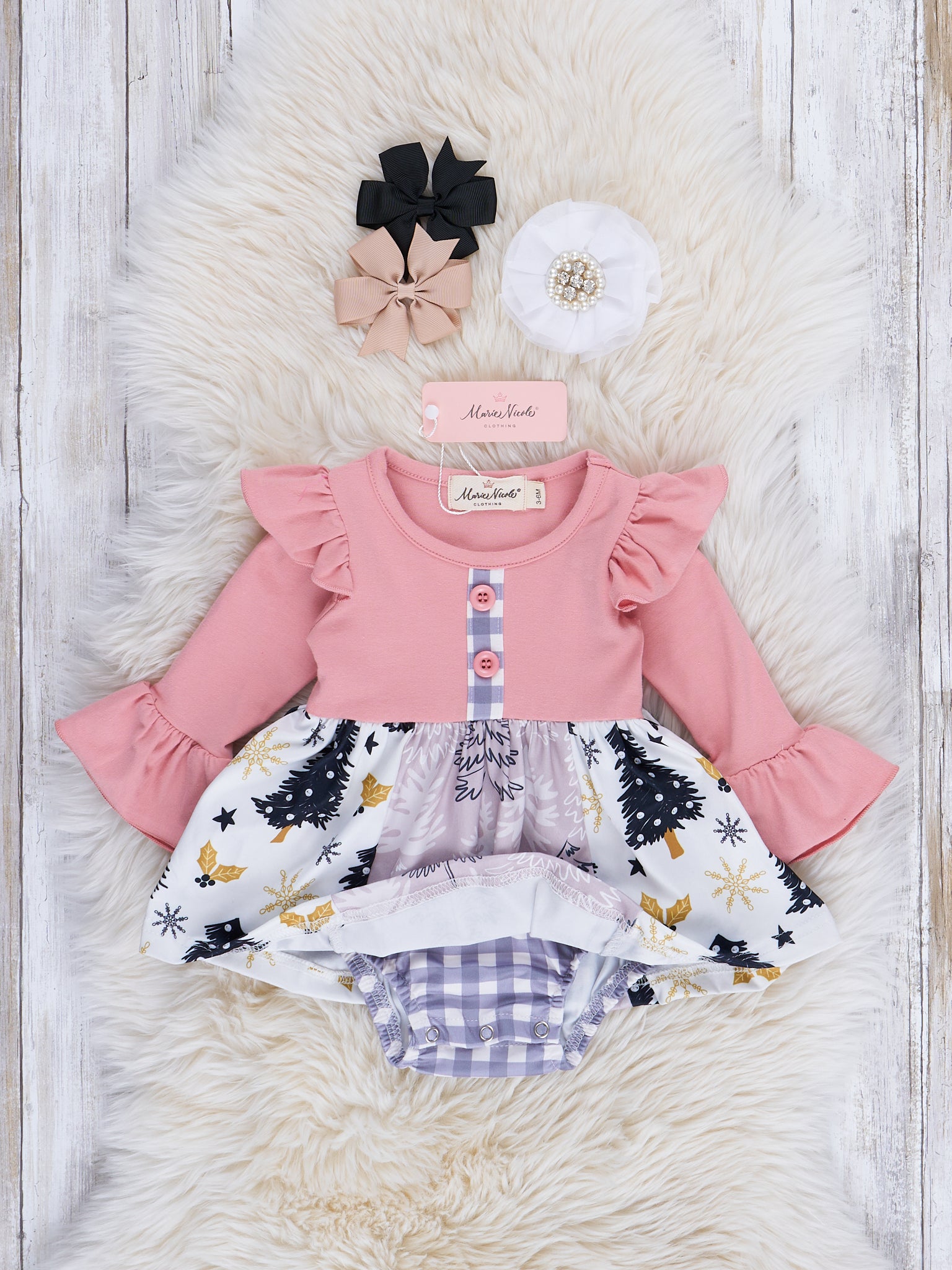 This sister set is a charming blend of style and playfulness! 🌟 Perfect for cooler months, this romper ensures your little one stands out with comfort and flair with its pink bodice and mixed print peplum skirt of purple gingham and Christmas trees. ✨