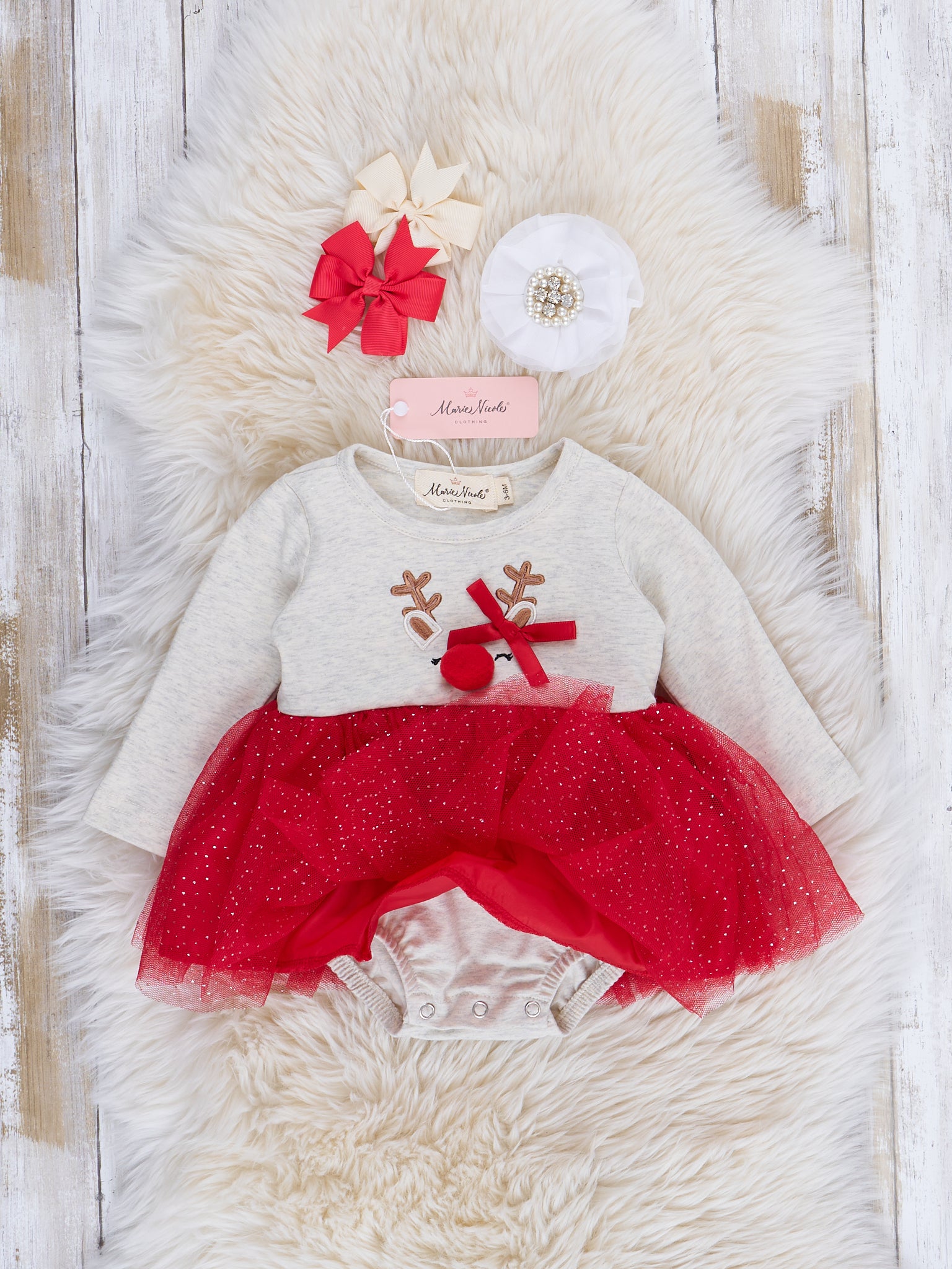 Red & Heathered Oatmeal Reindeer Sparkle Tulle Romper