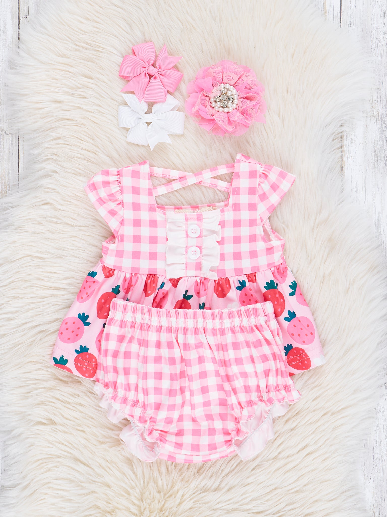 Get ready to give your wardrobe a sweet upgrade with our Plaid Strawberries & Cream sister set! This outfit features a playful mixed print top paired with adorable plaid bloomers, giving you the perfect blend of quirky and cute. Say goodbye to boring outfits and hello to a berry-licious new look!