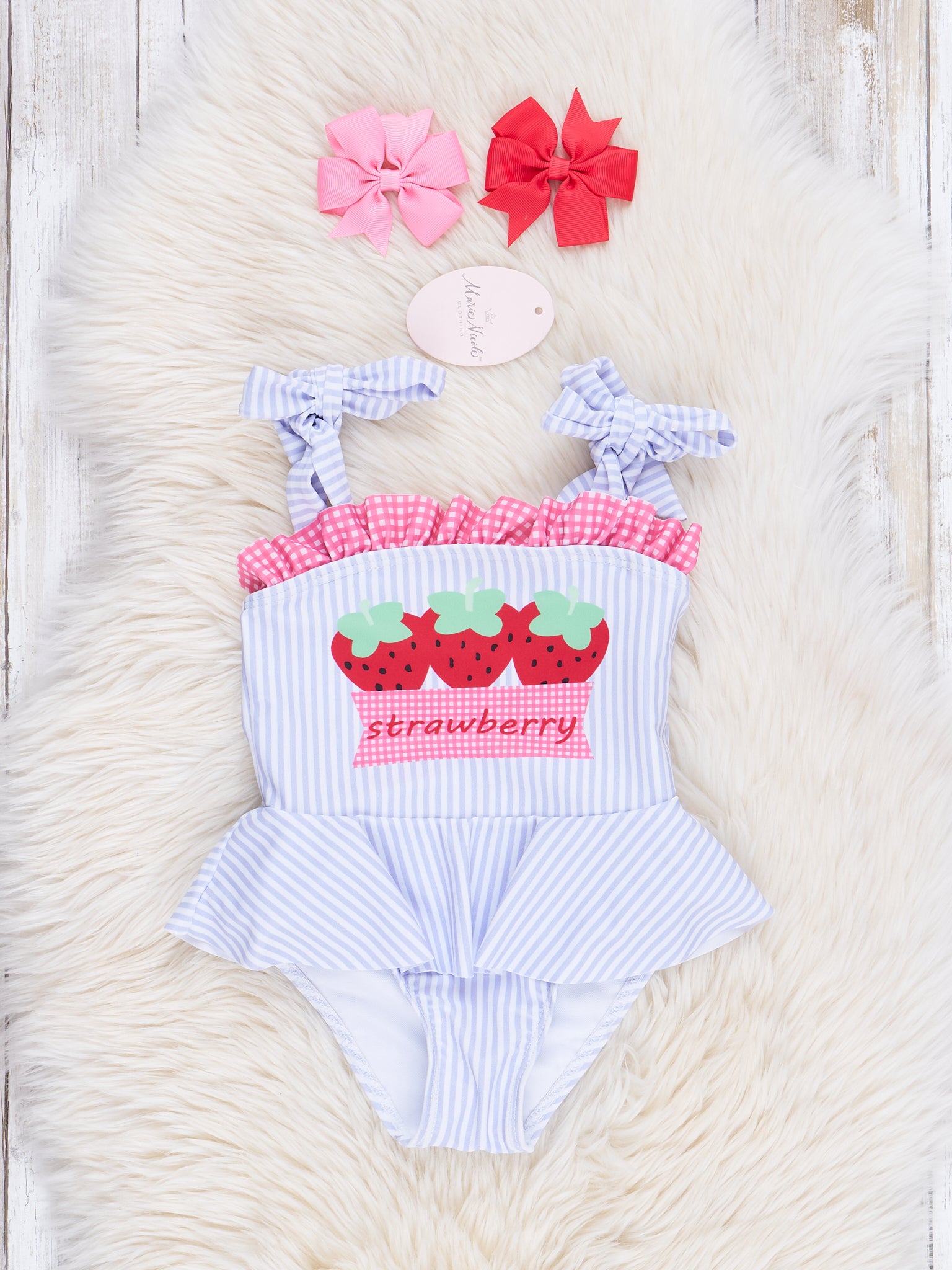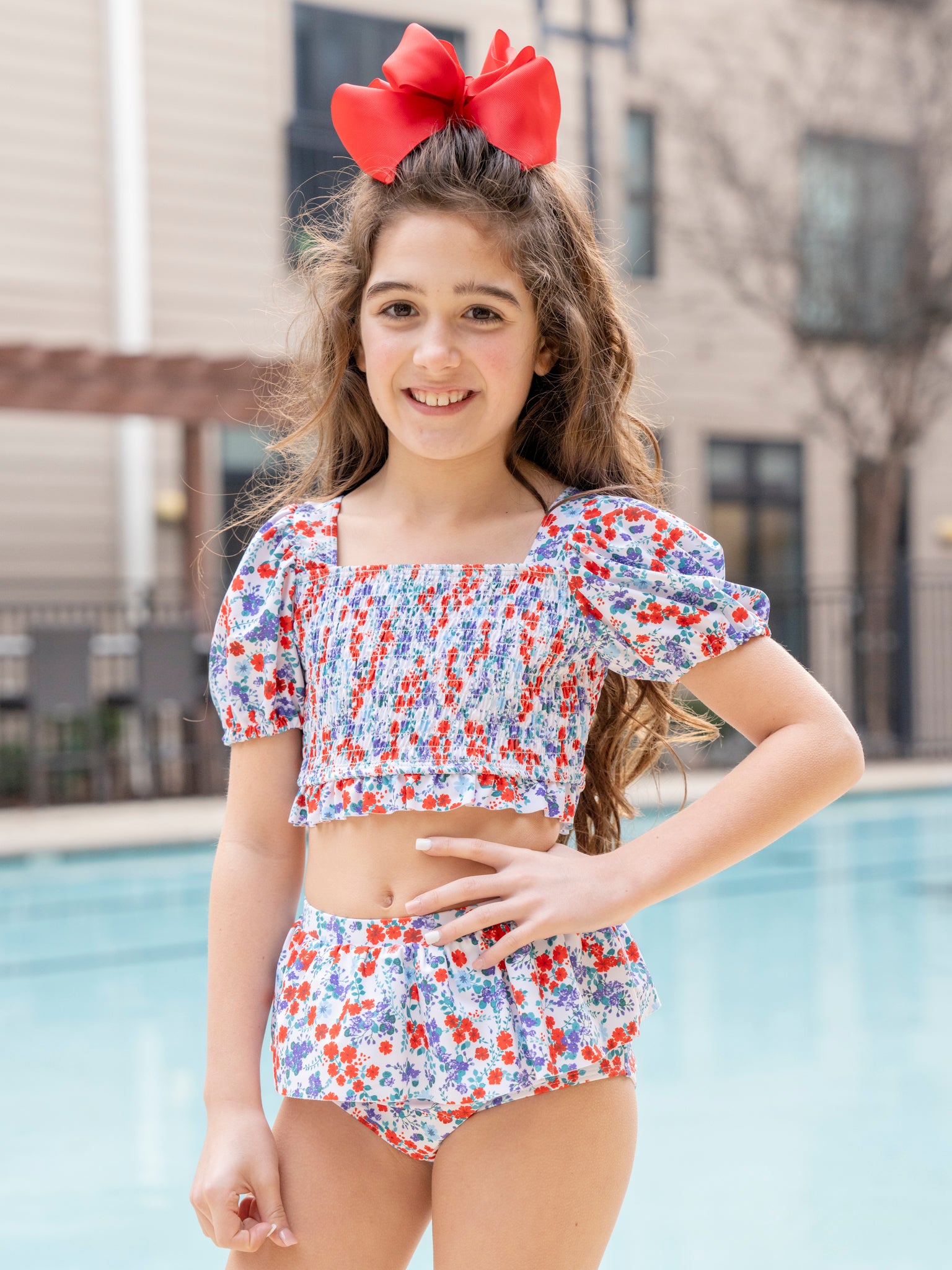 Red & Blue Floral Puff Sleeve Ruffle Swimsuit
