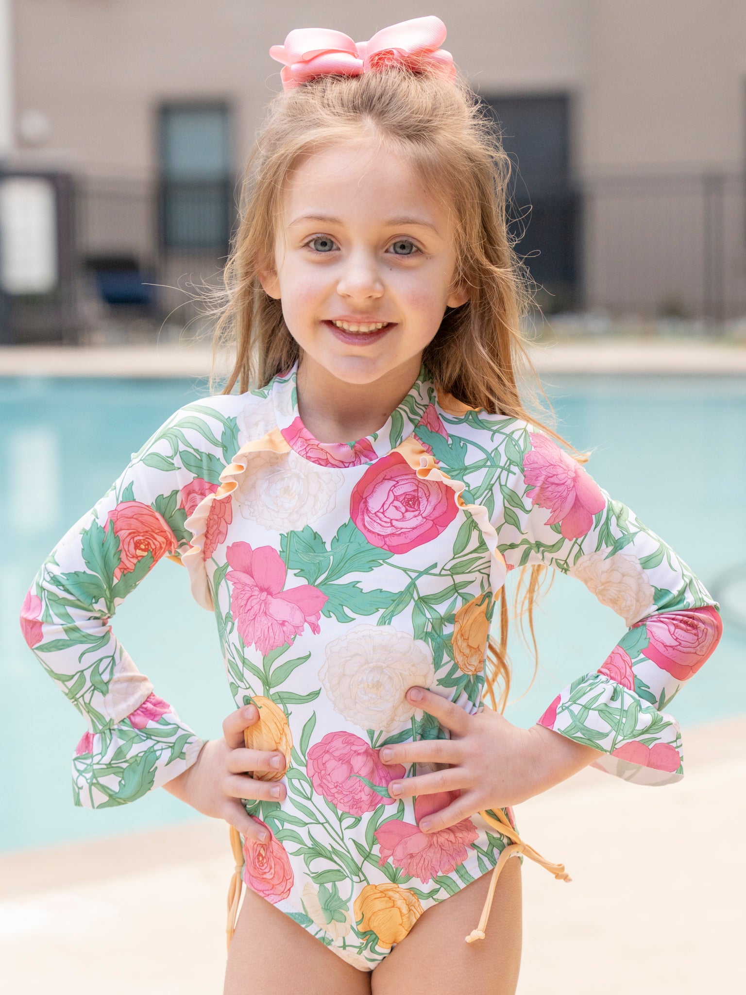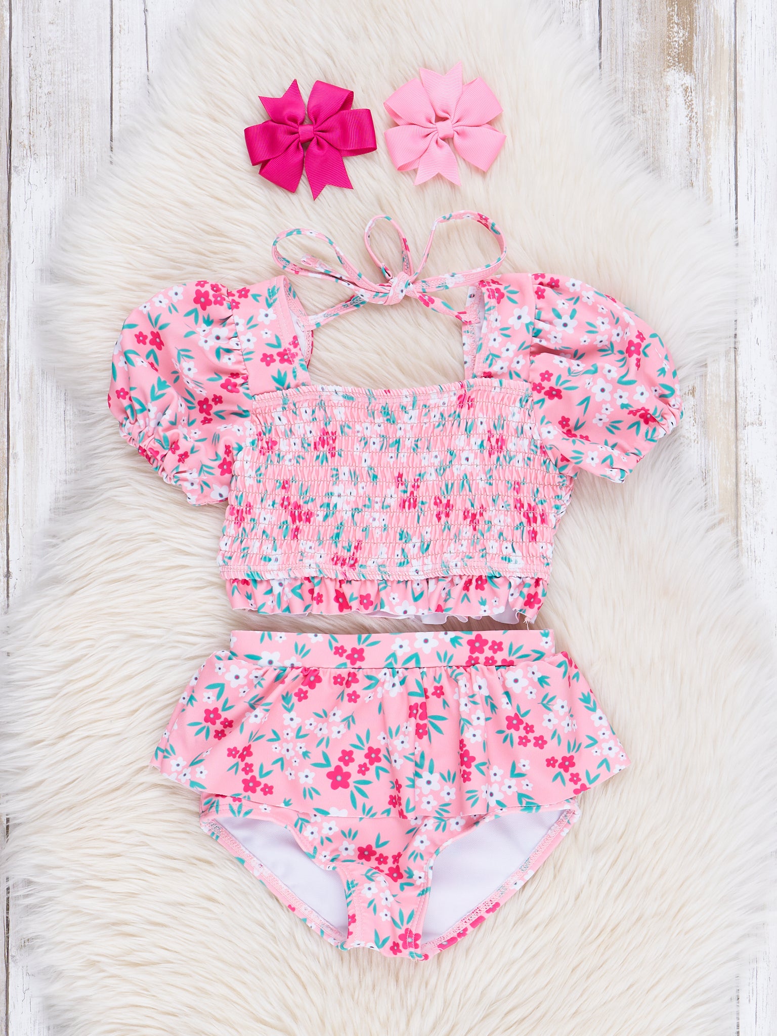 Pink Floral Puff Sleeve Ruffle Swimsuit