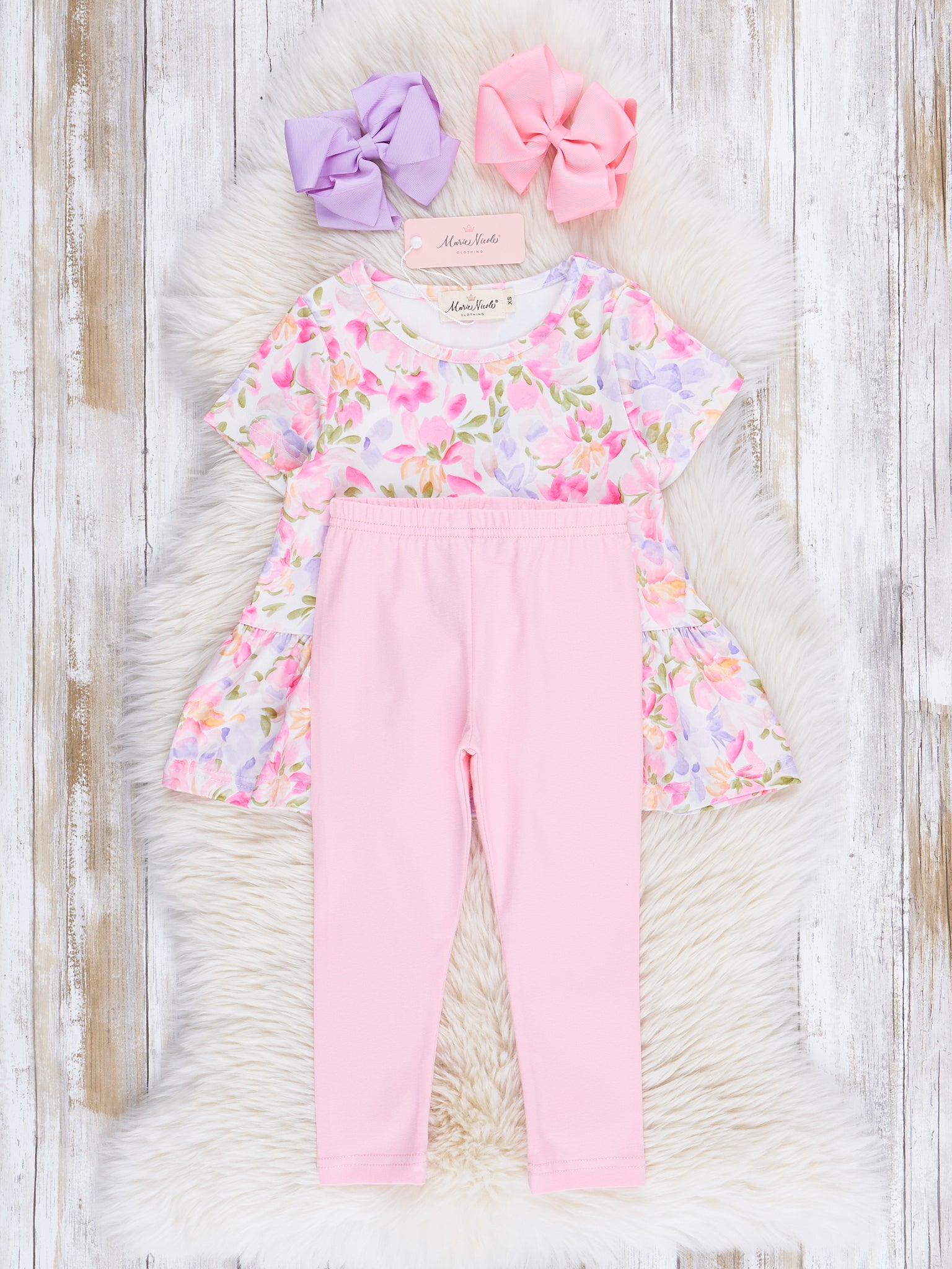 Flaunt your flower power with our Pink Soft Florals Peplum Outfit. This stylish set includes a floral peplum top paired with comfy pink leggings for a playful and chic look. Perfect for any occasion, our outfit will have you feeling confident and effortlessly stylish.