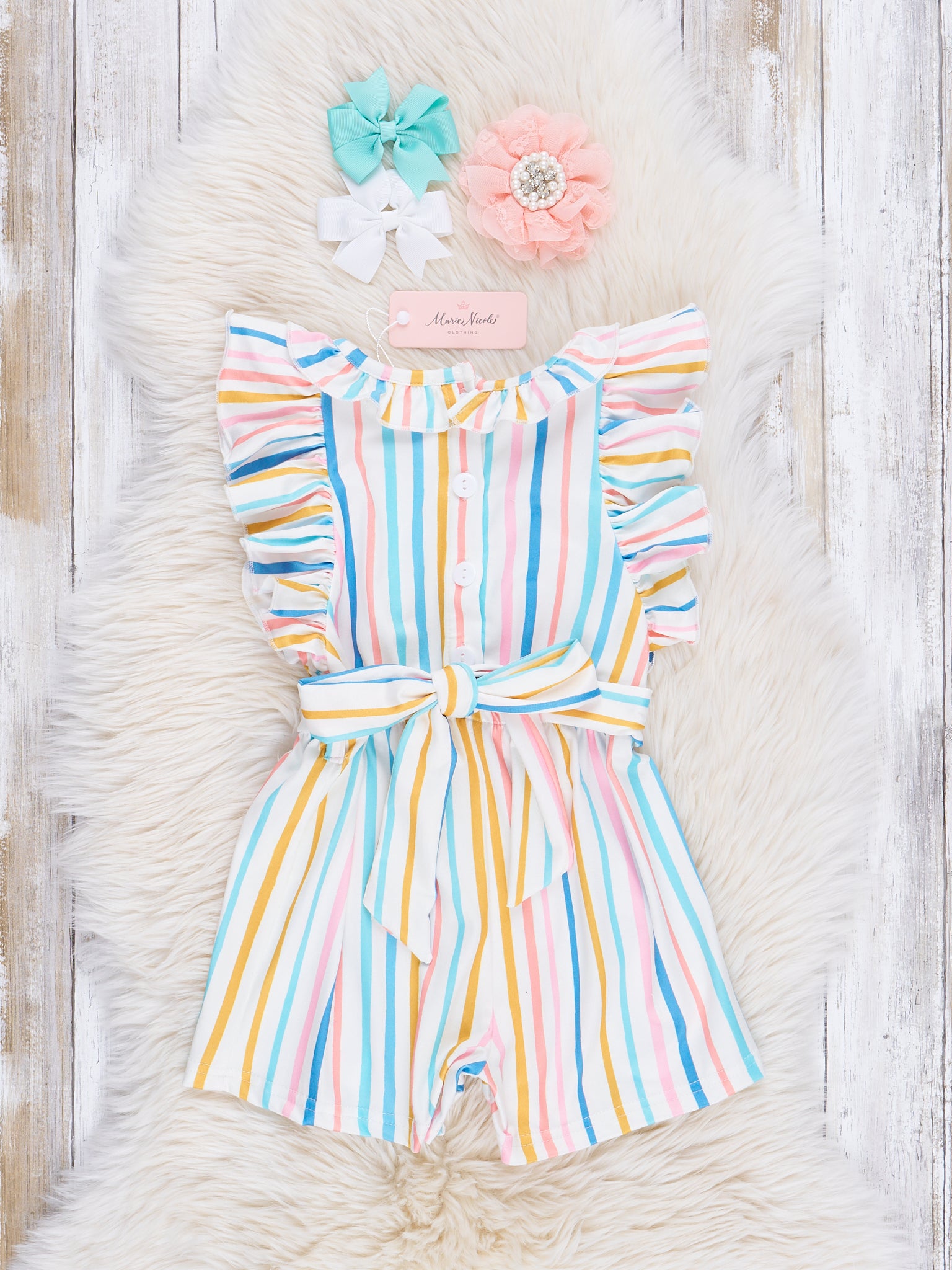 Add a pop of color to your little one's wardrobe with this quirky Rainbow Stripes Ruffle Romper. Perfect for summer playdates, the ruffle collar and shoulder add a playful touch to the classic striped design. Let your girl's unique style shine through with this fun and fashionable romper.
