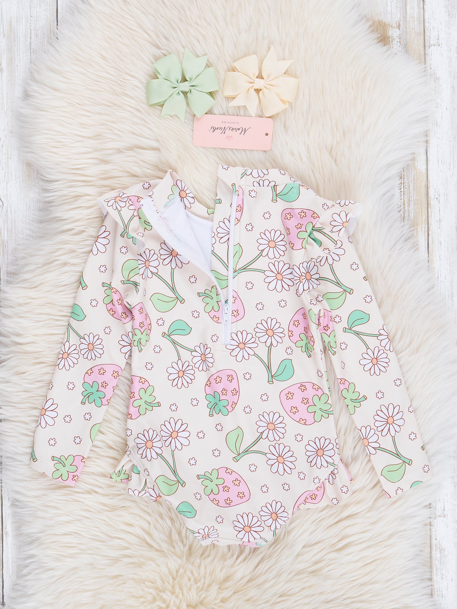 Cream Stawberries & Daisies Ruffle Swimsuit