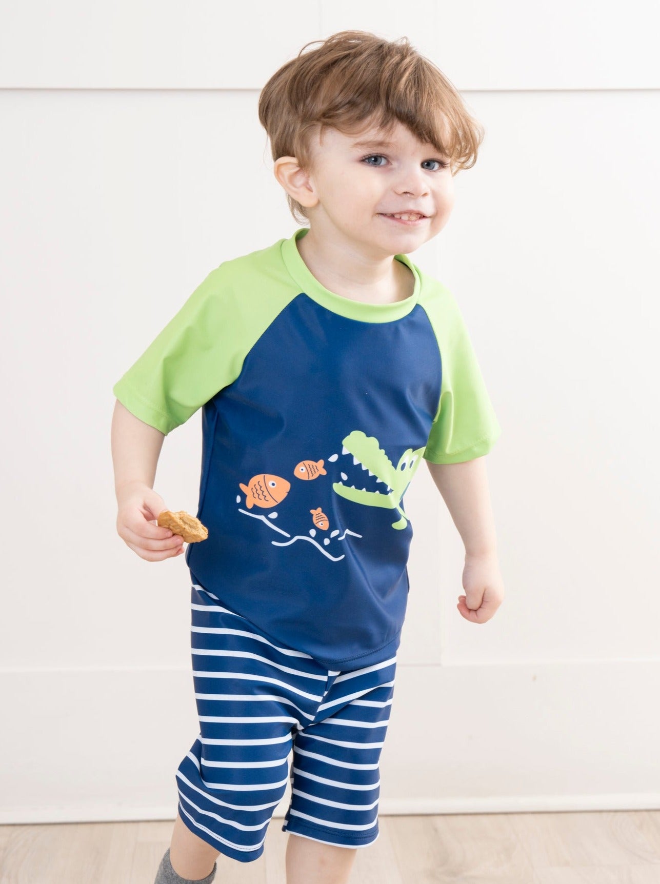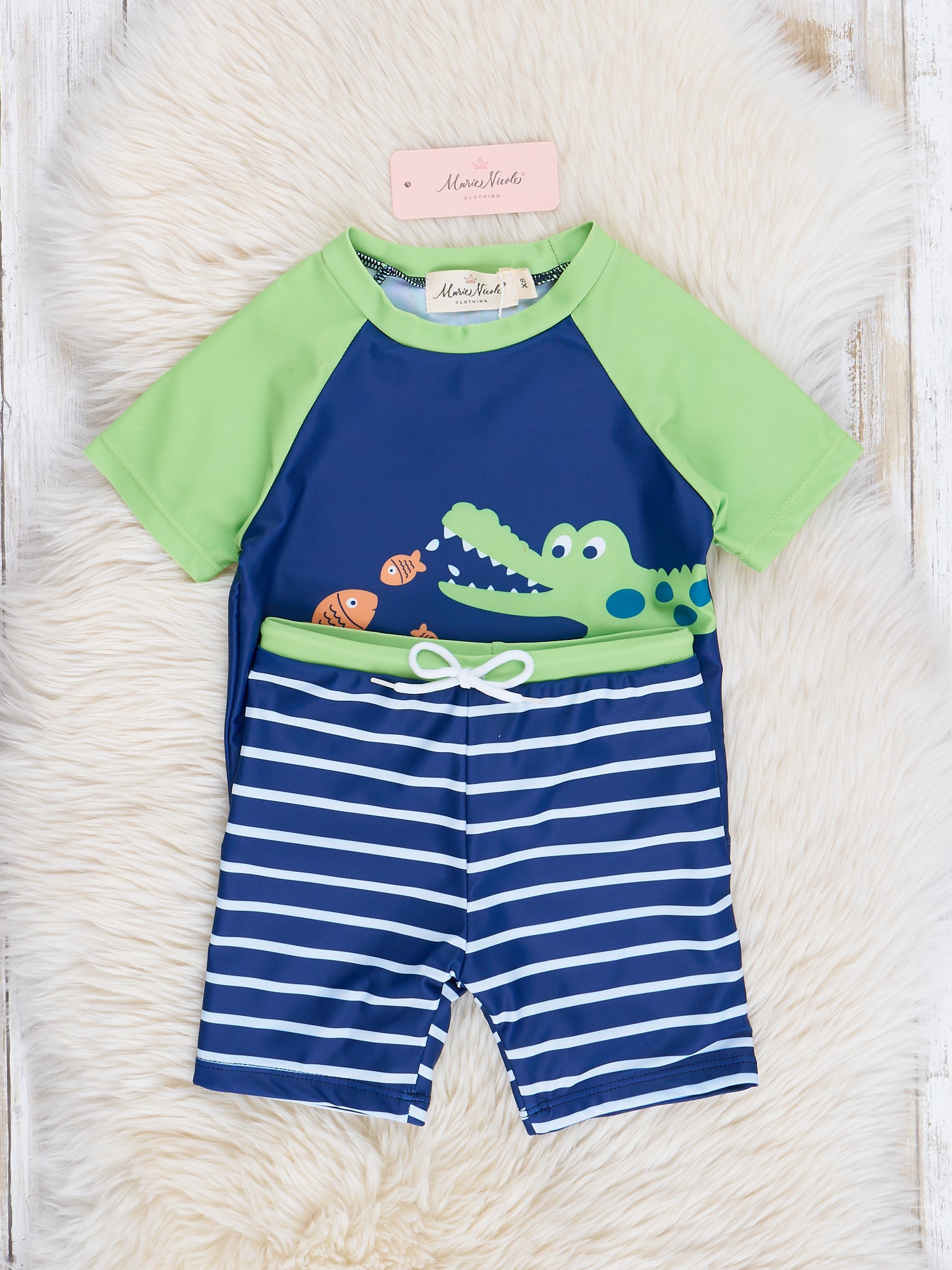 Make a splash with our adorable Navy & Lime Alligator Striped Swim Set. The raglan sleeve top features a playful alligator print, while the striped shorts add a touch of fun. Perfect for a splashing around, this set is sure to make a statement!
