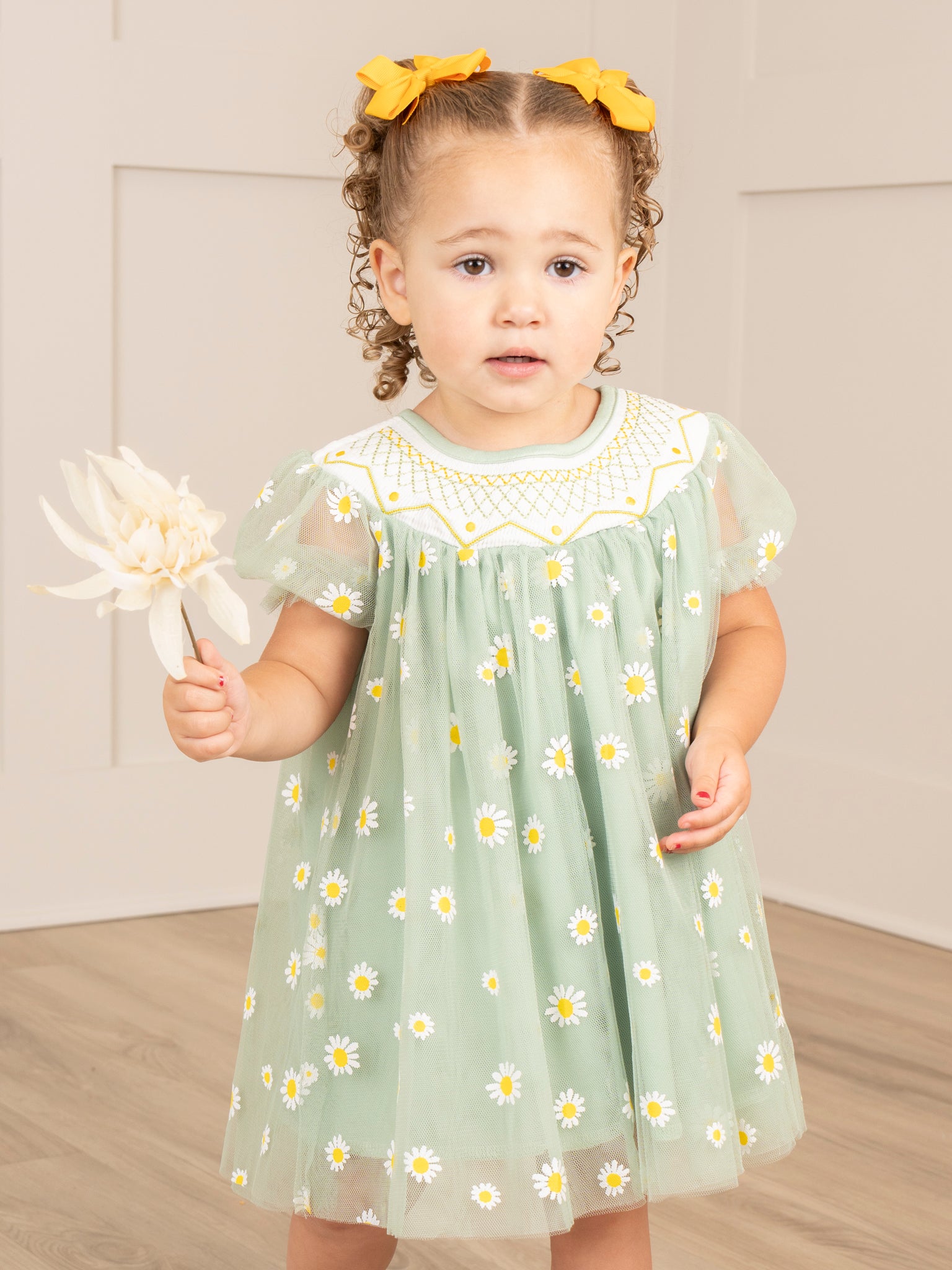 Green Smocked Garden Blooms Tulle Overlay Dress