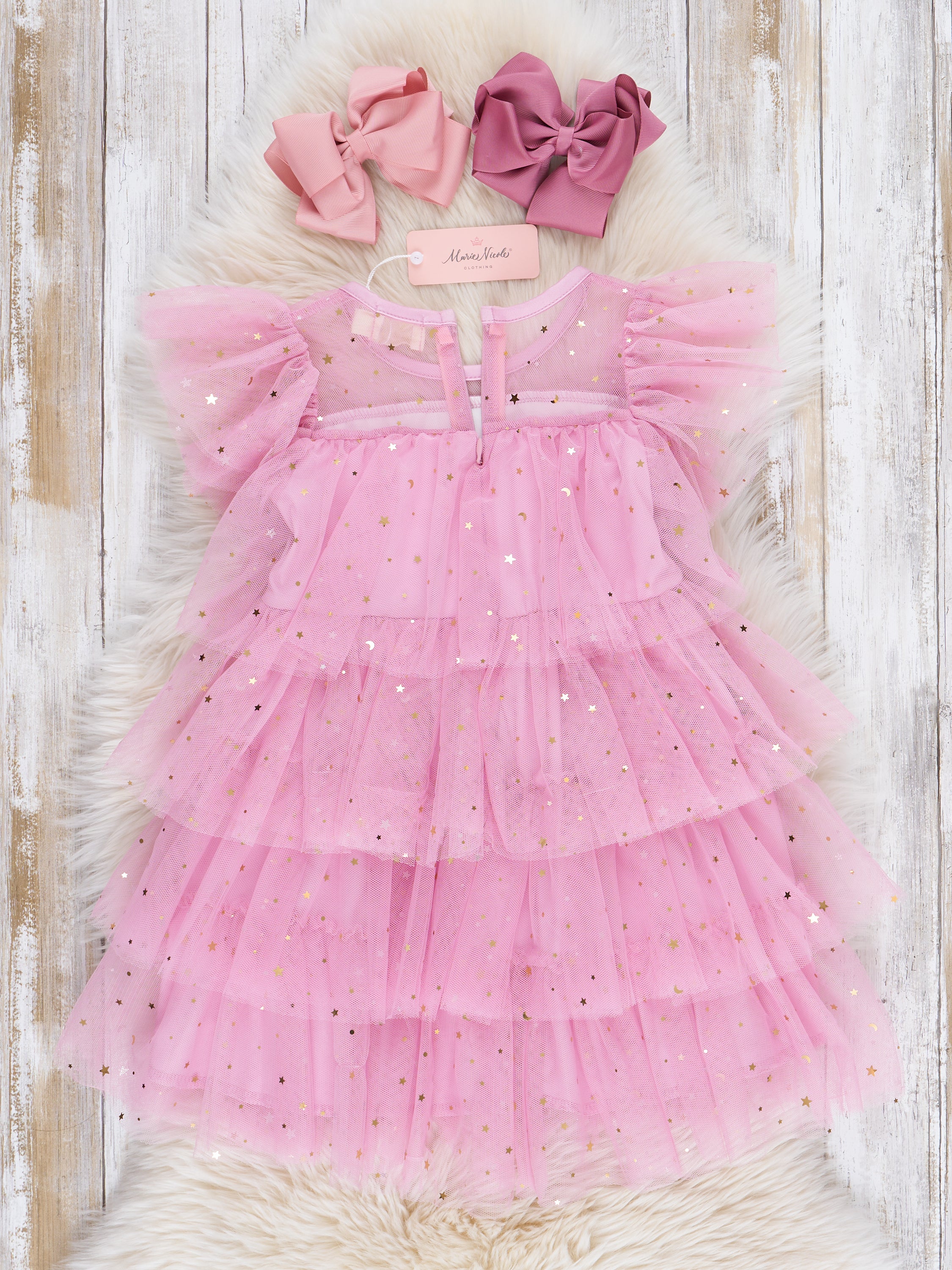 Add a sprinkle of fun to any occasion with our Pink Sparkles Cupcake Tulle Dress, designed specially for MNC. With its pink tiered cupcake tulle and gold star and moon sparkles, your little girl will stand out and feel like a princess. The flutter sleeves add a touch of sweetness to complete this playful look.