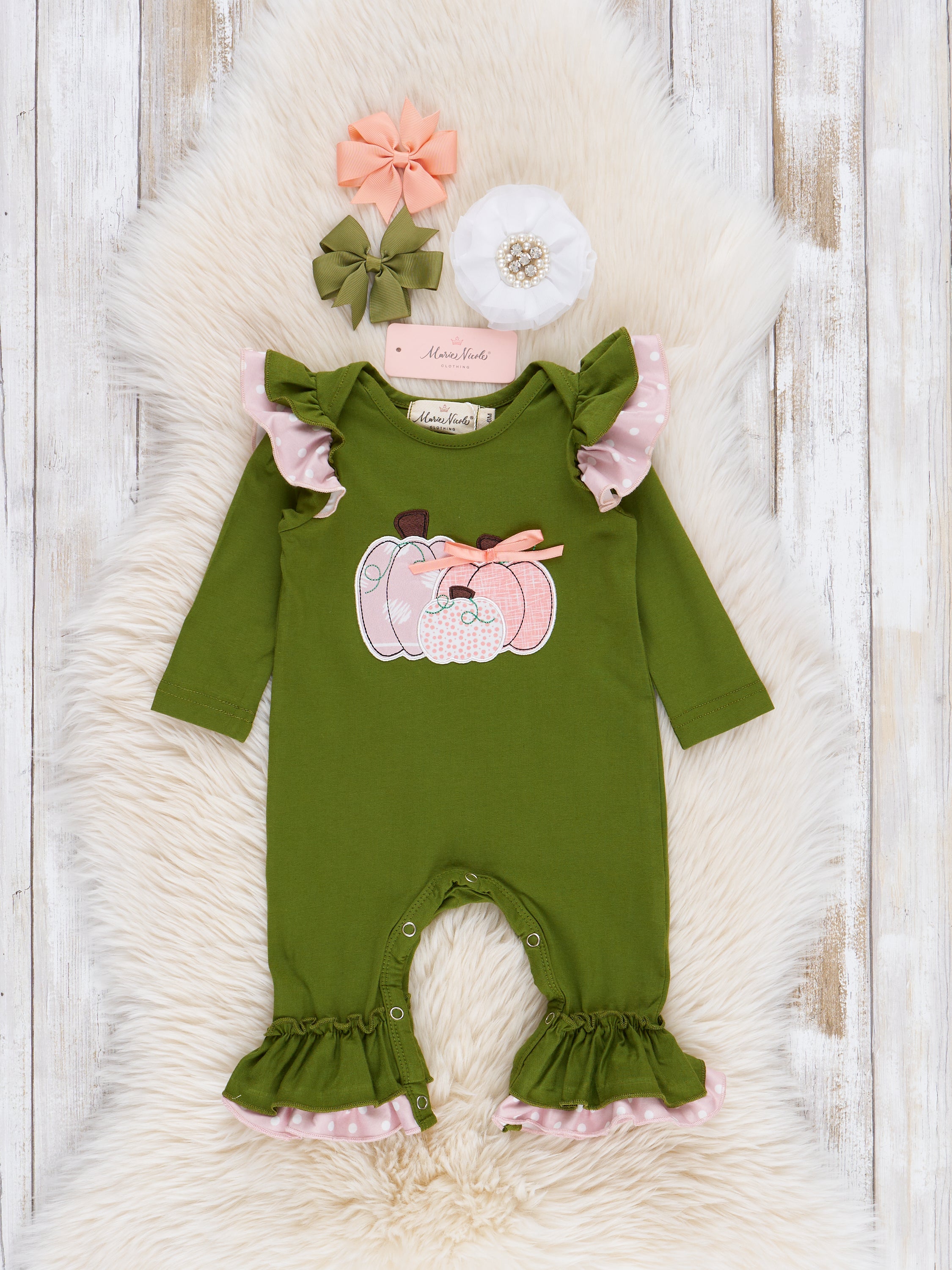 Green & Peach Embroidered Pumpkin Patch Ruffle Romper