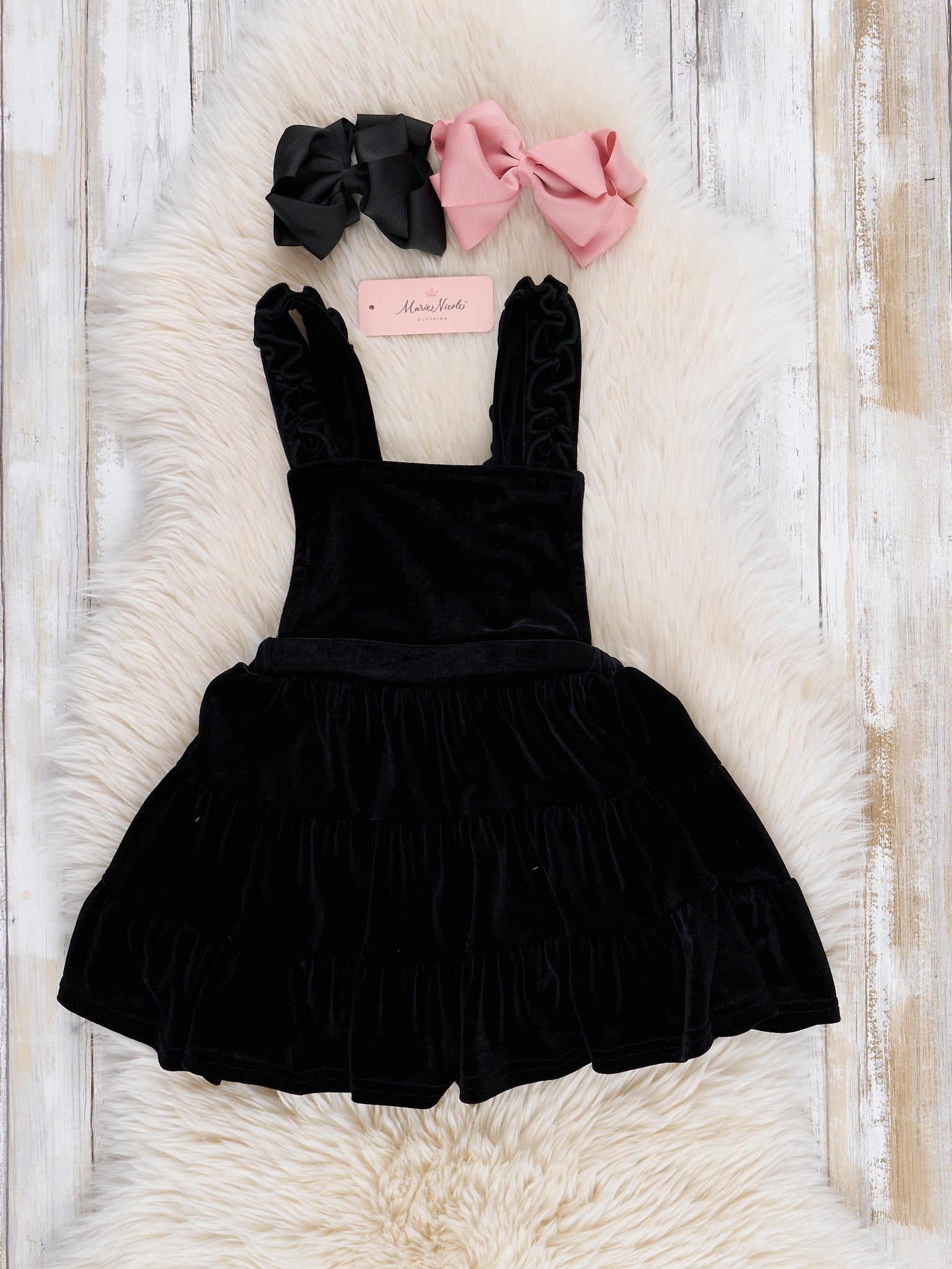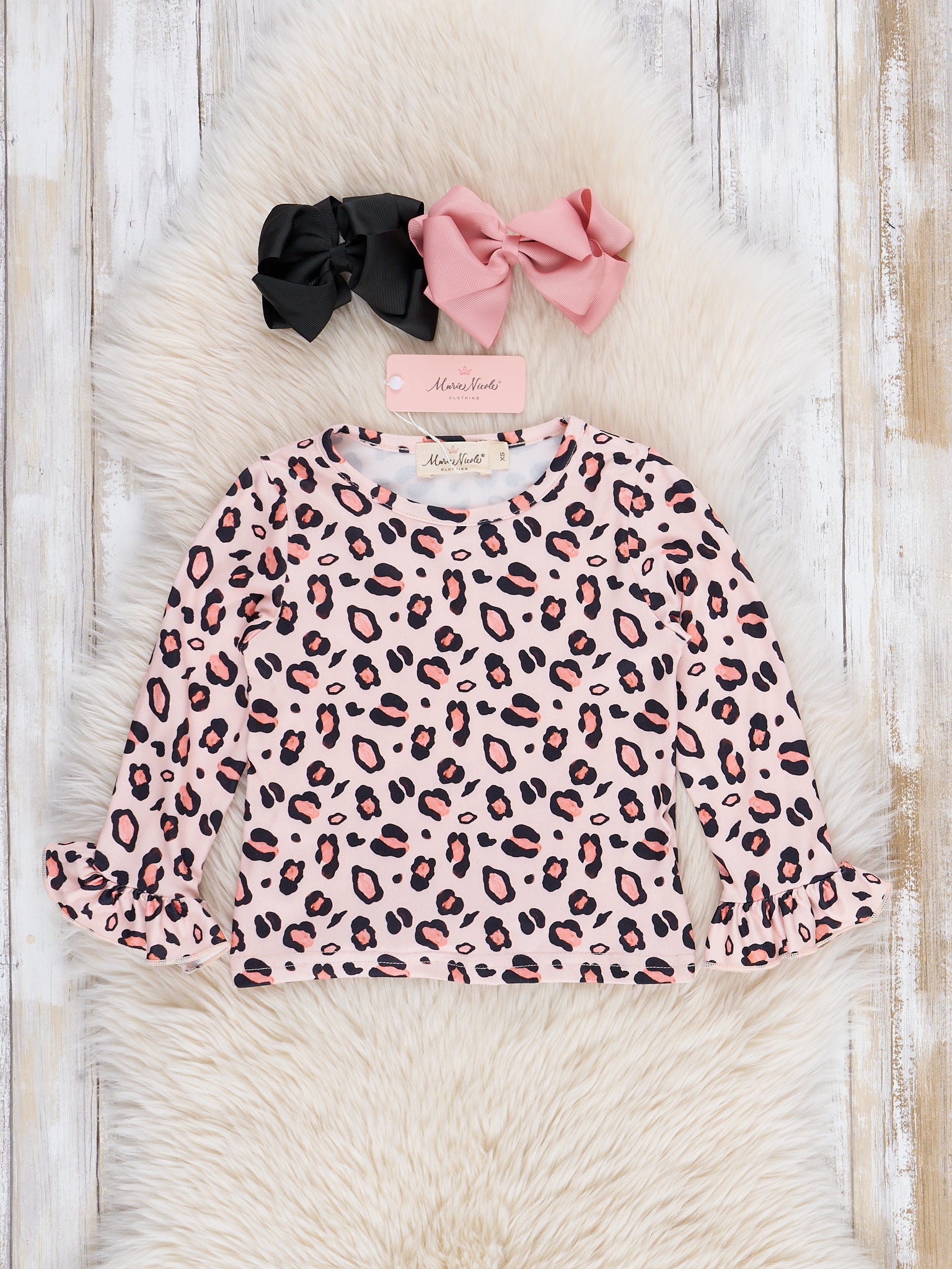 Revamp your little fashionista's wardrobe with this Black Velvet Leopard Ruffle Skirtall Set! Designed for girls, it features a trendy velvet skirtall paired with a playful pink leopard ruffle shirt. Perfect for a day out or a special occasion, this outfit will have your little one feeling stylish and confident.