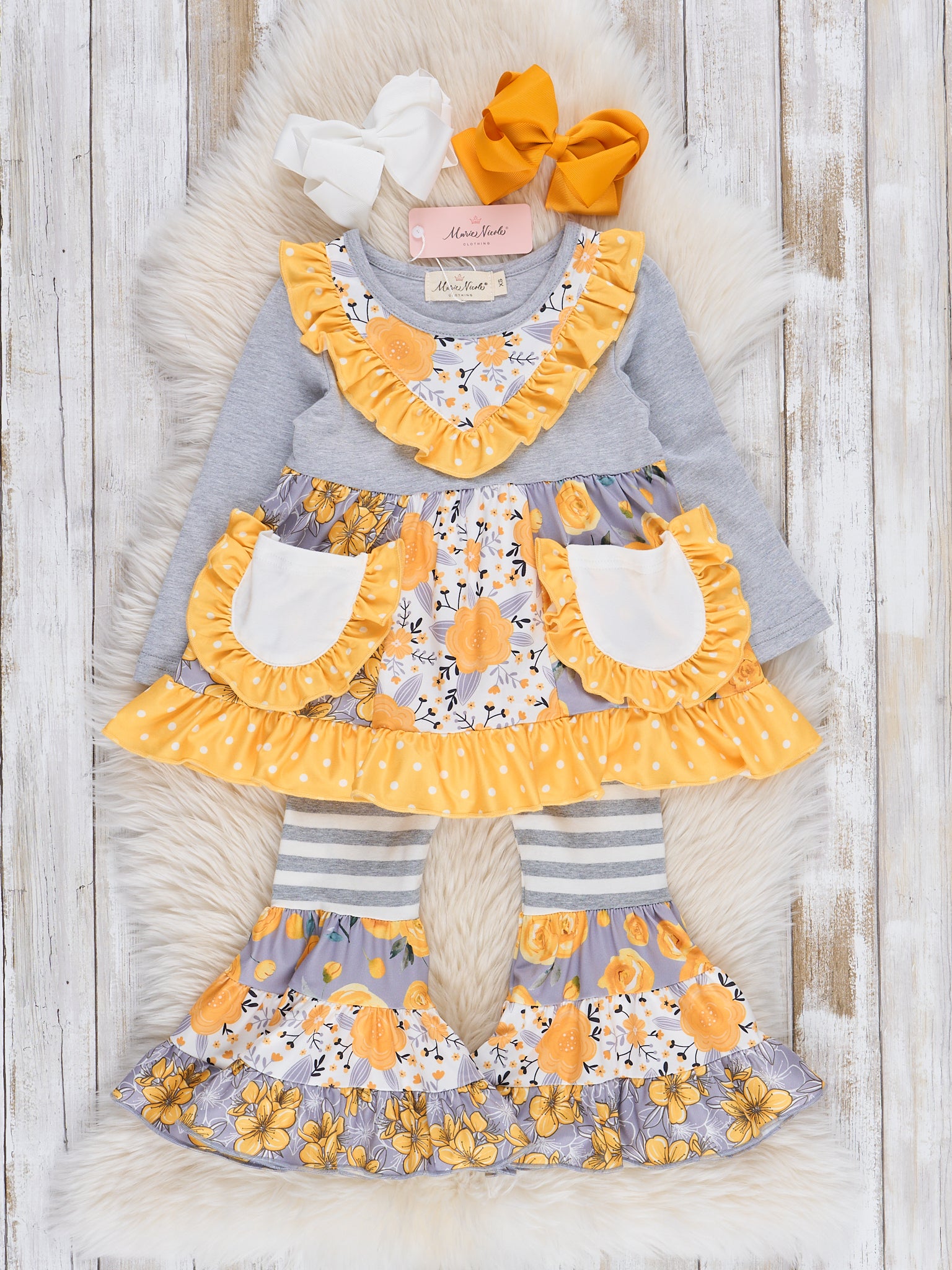 Grey Striped Smocked Gingerbread Ruffle Outfit