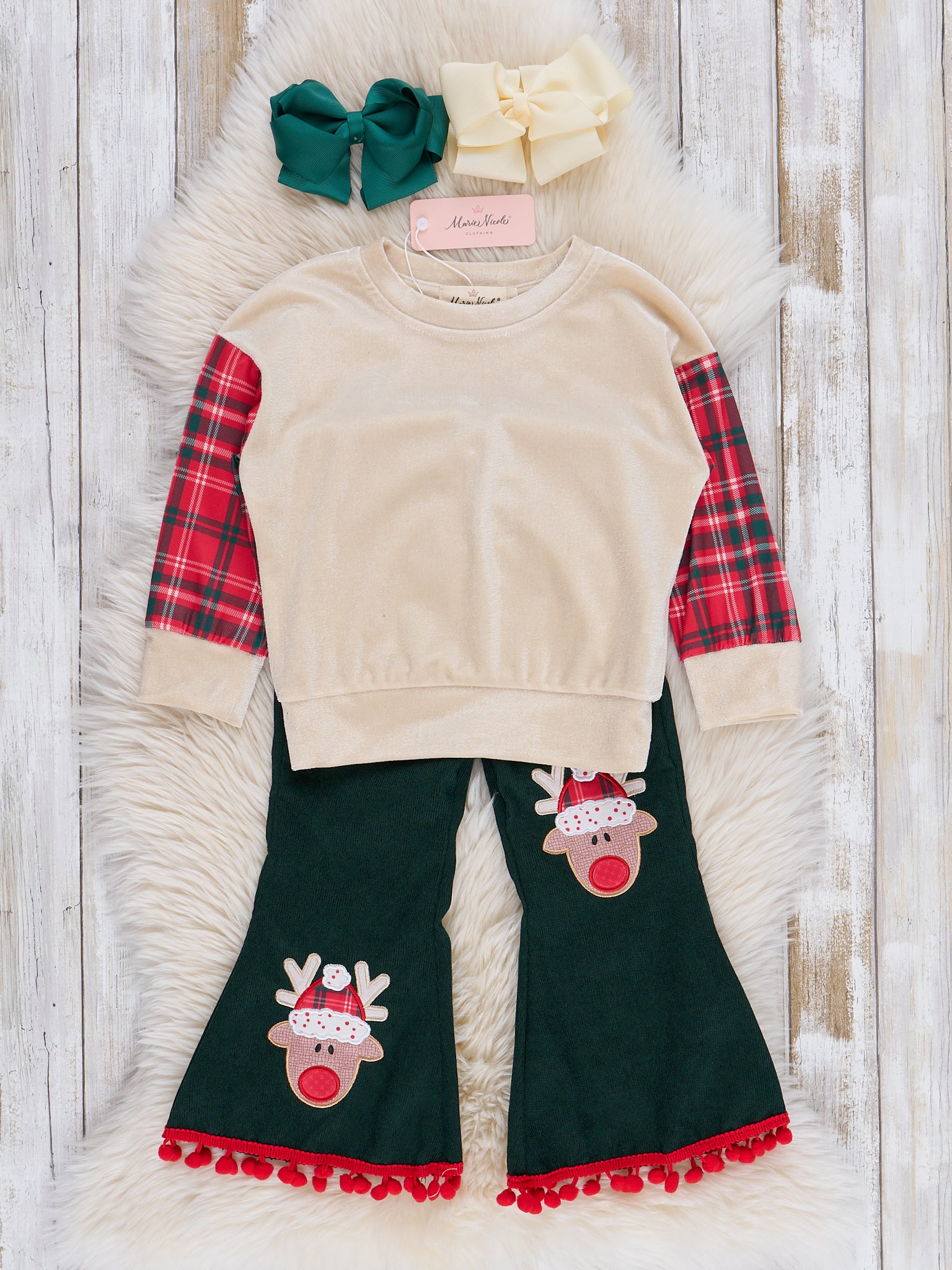 Red Plaid & Green Reindeer Cheer Bell Bottoms Outfit