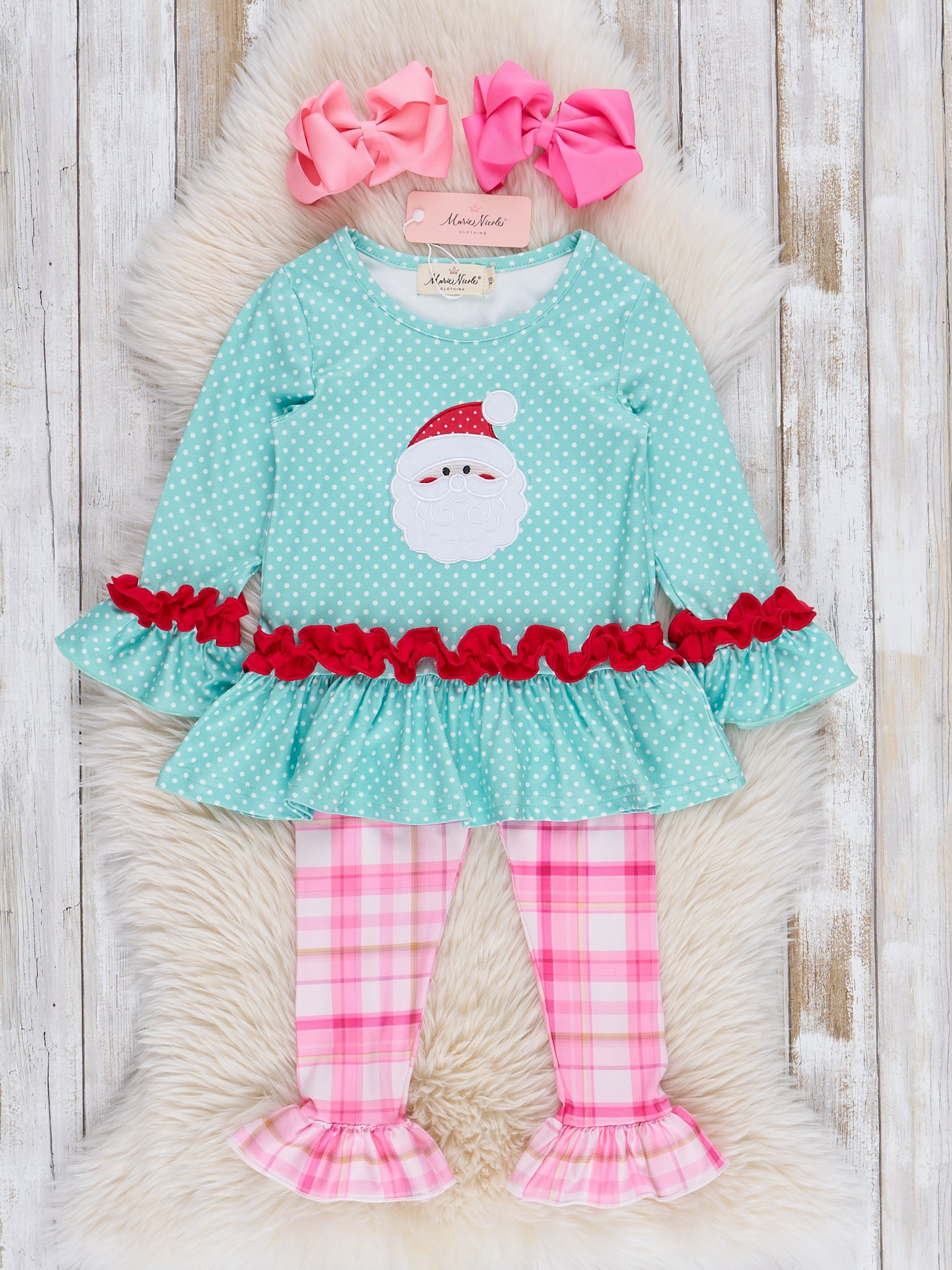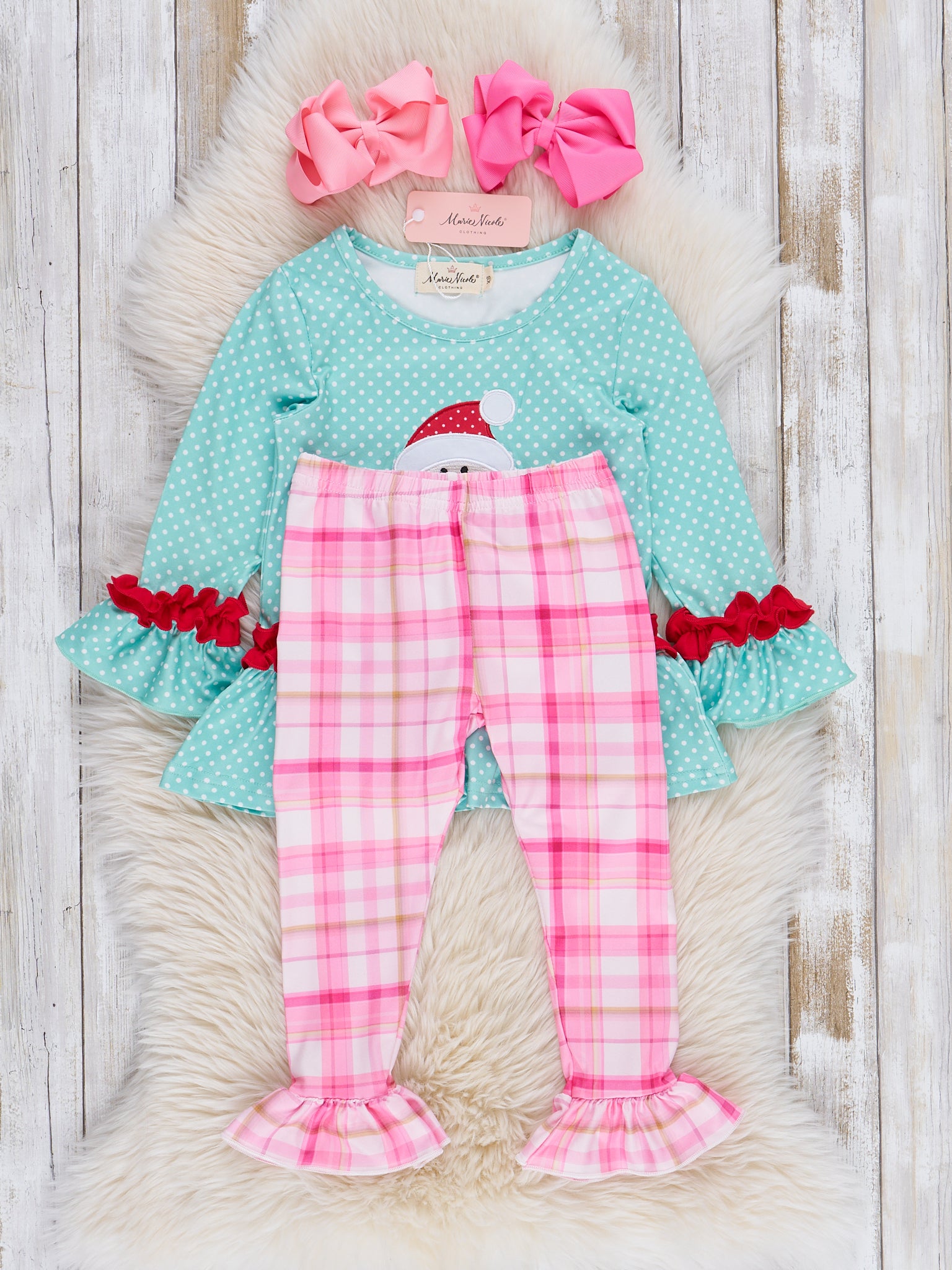 Teal Dots & Pink Plaid Santa Ruffle Outfit