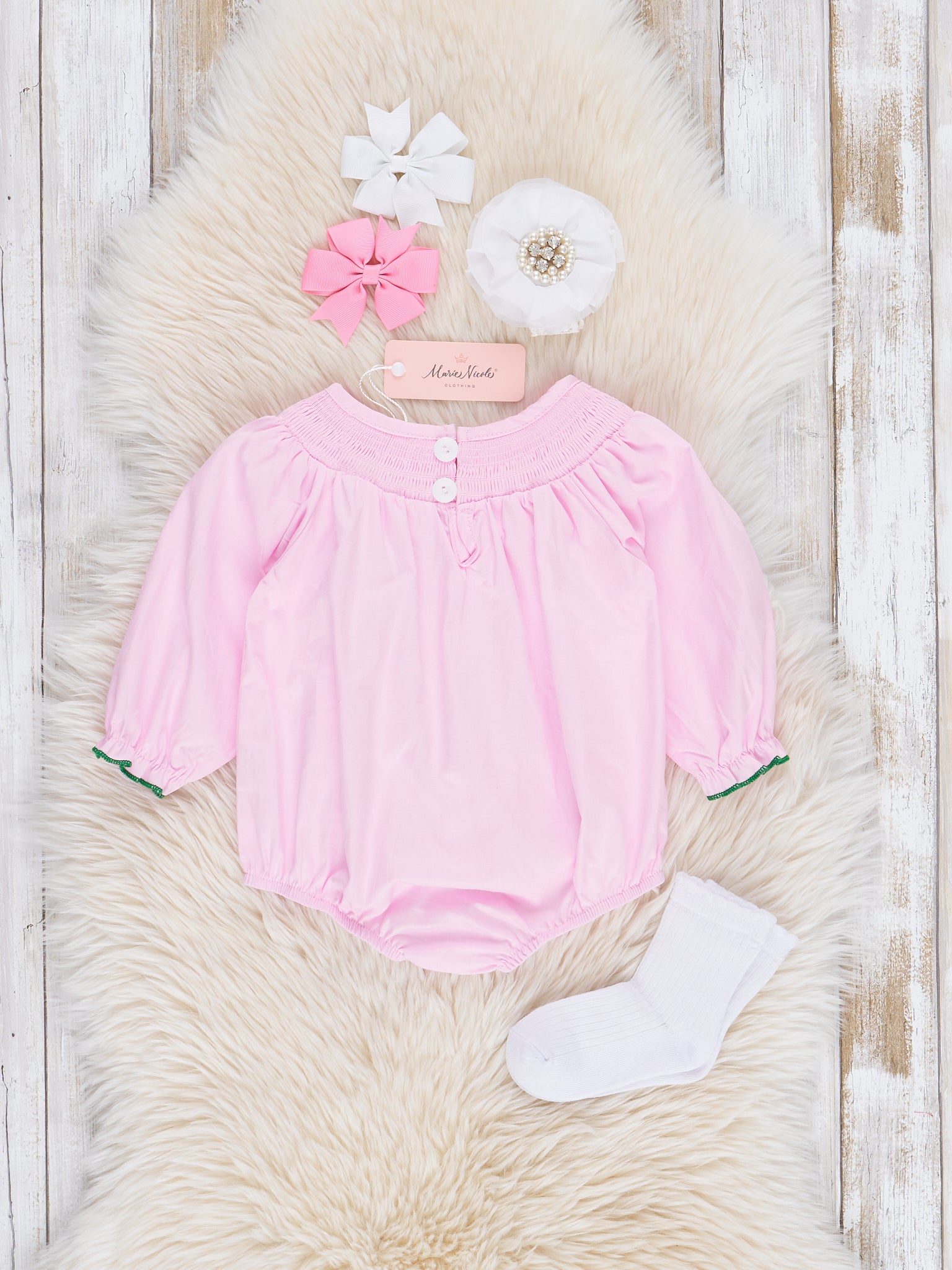 Get ready for the holidays with our Pink Smocked Holiday Berries Cotton Bubble! This girls bubble is made of 100% cotton and features an embroidered holly berry design on the smocked collar. The green bow sleeve accents add a festive touch. Don't forget to check out our sister set for the perfect holiday look!