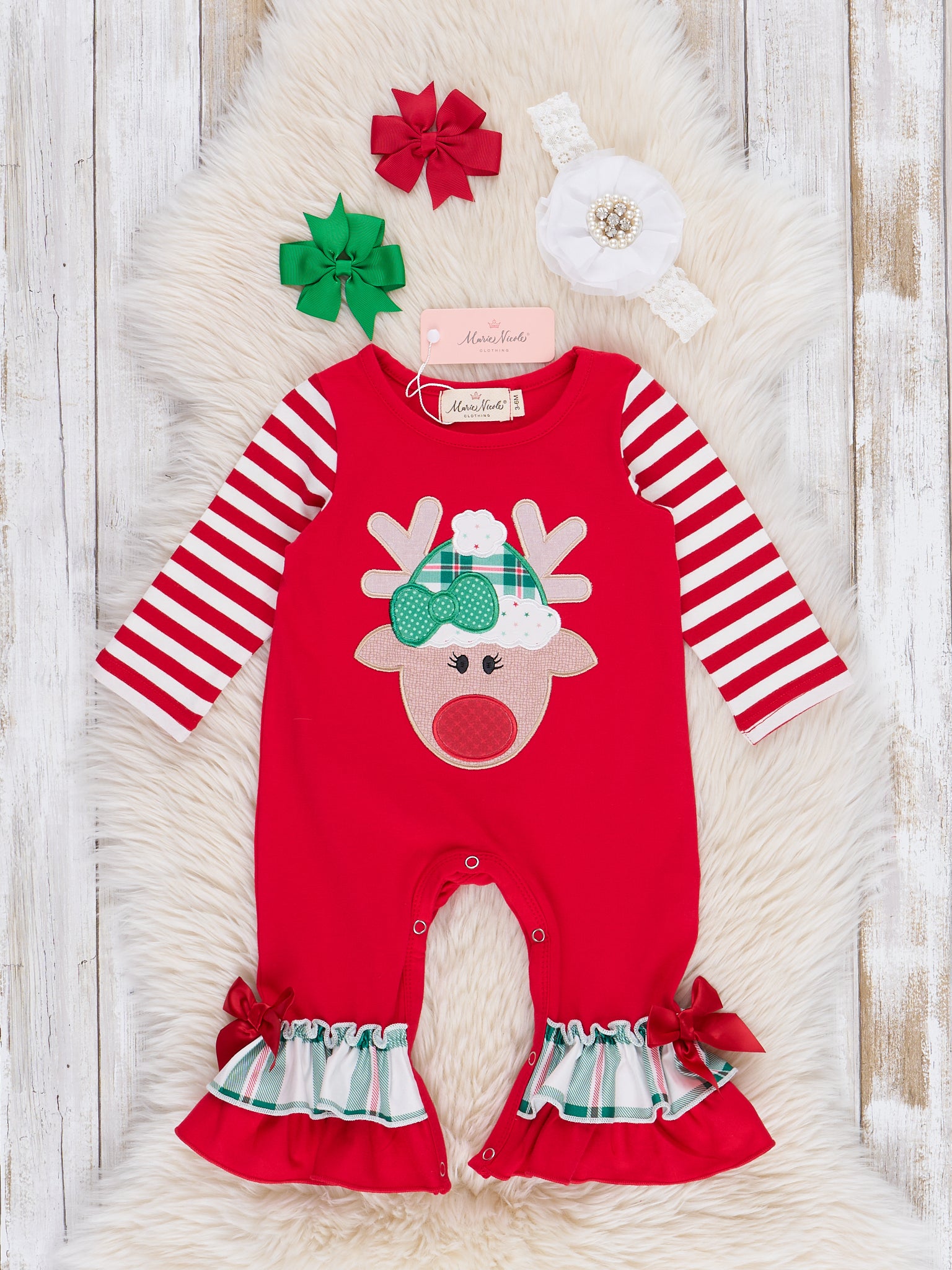 Pink Smocked Prancing Reindeer Ruffle Romper