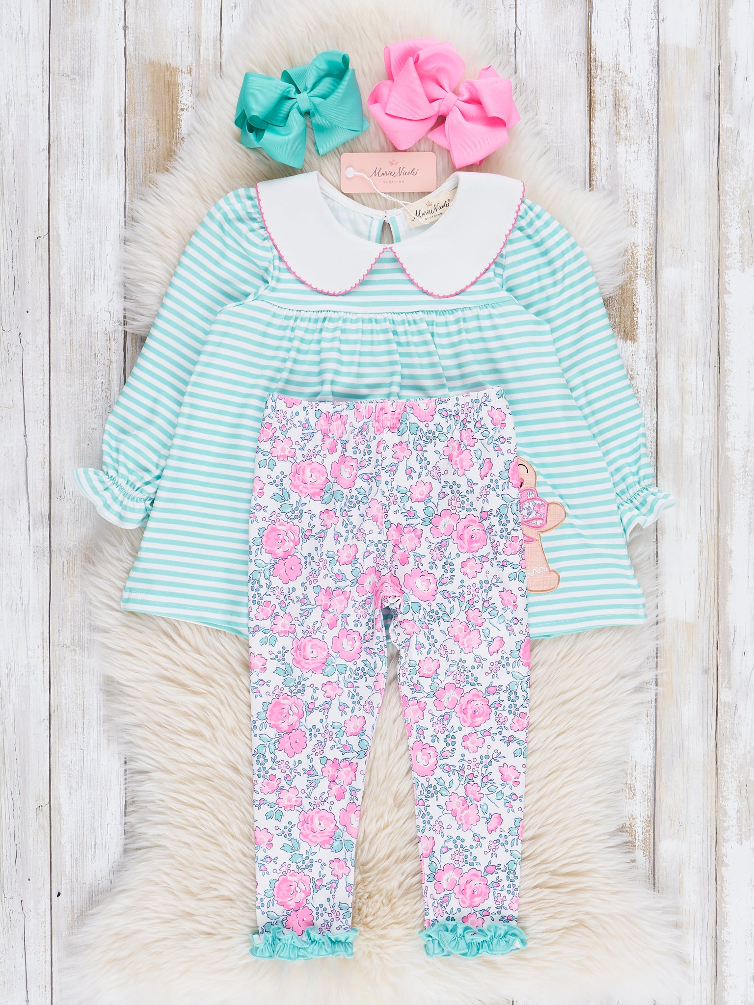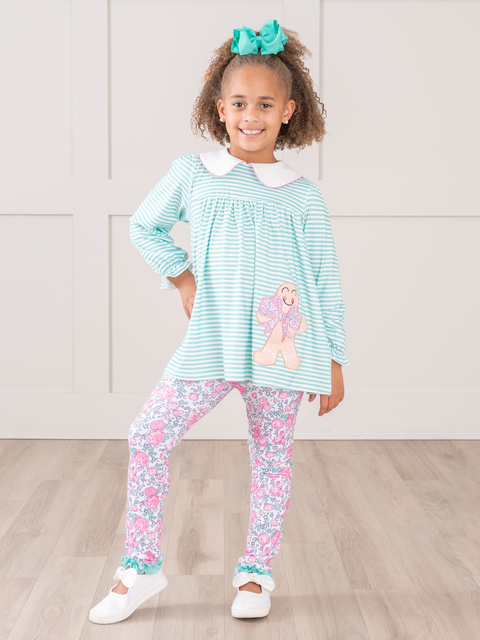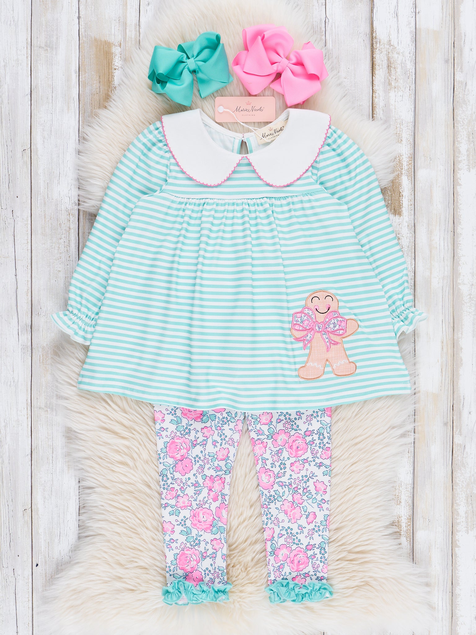 Get ready for some festive fun with our Mint Embroidered Gingerbread Striped Outfit! This girls' outfit features a playful striped top with an embroidered gingerbread cookie, paired with floral bloomers for a perfectly sweet and stylish Christmas look. Complete the look with our matching sibling set.