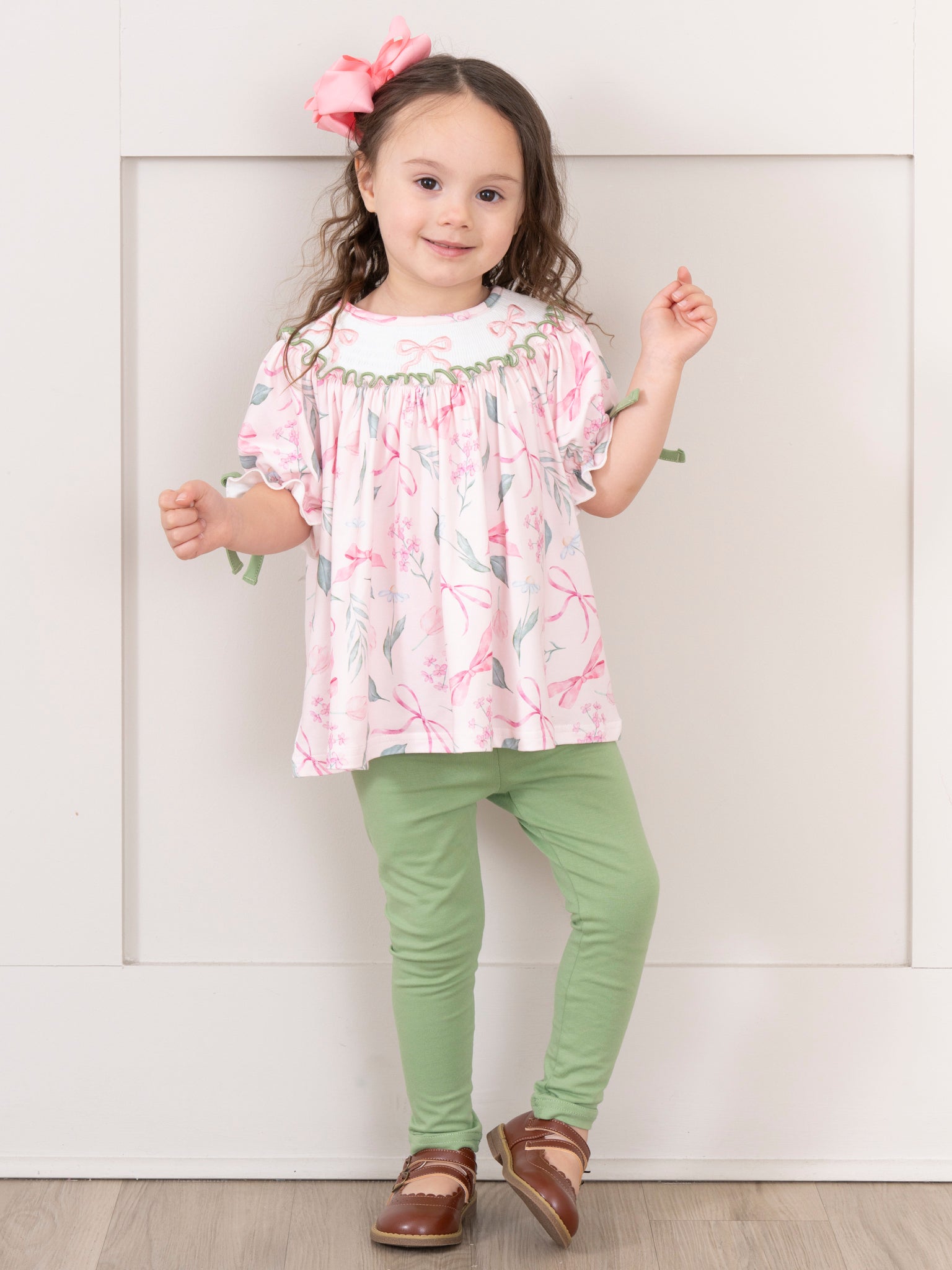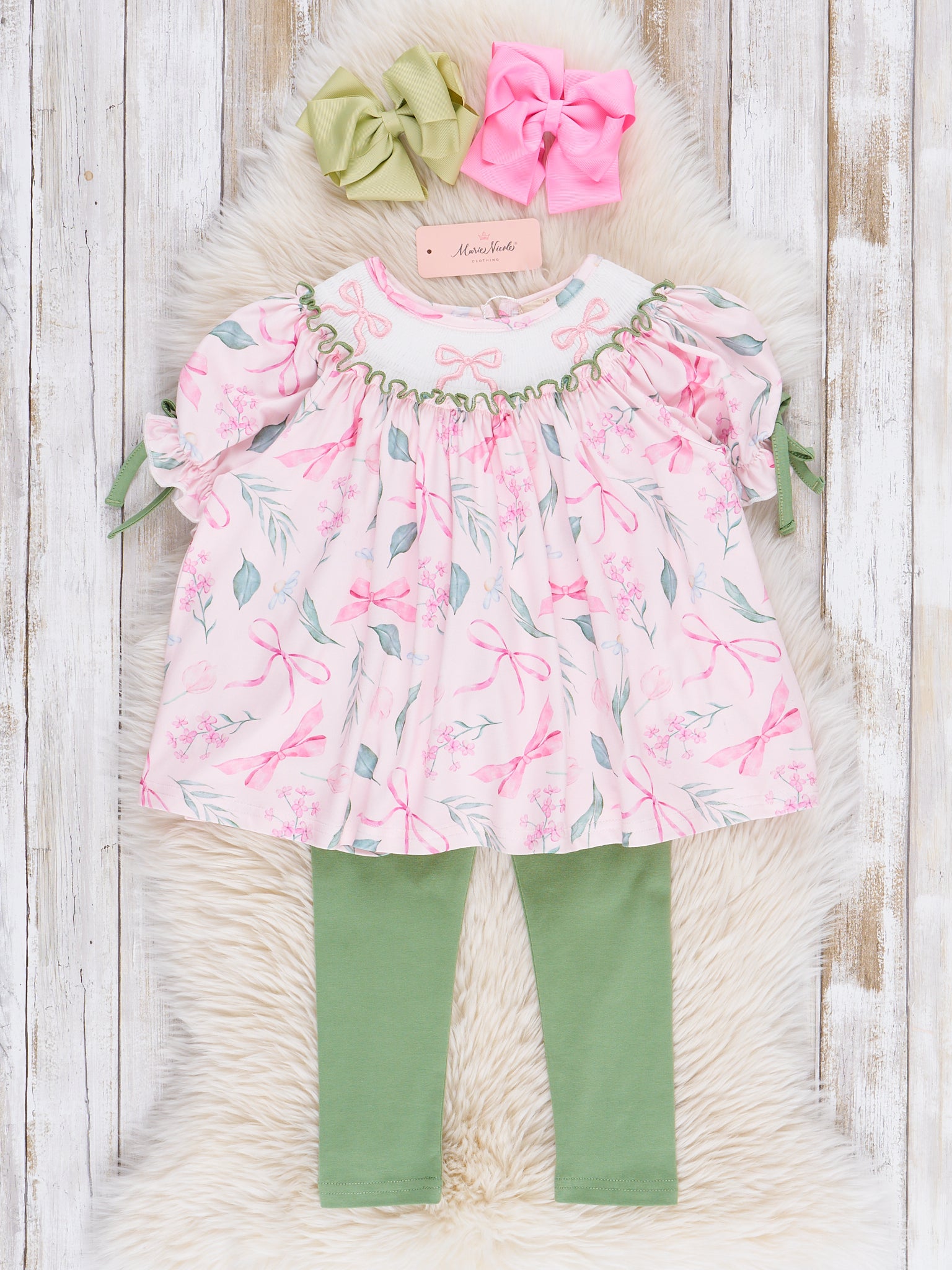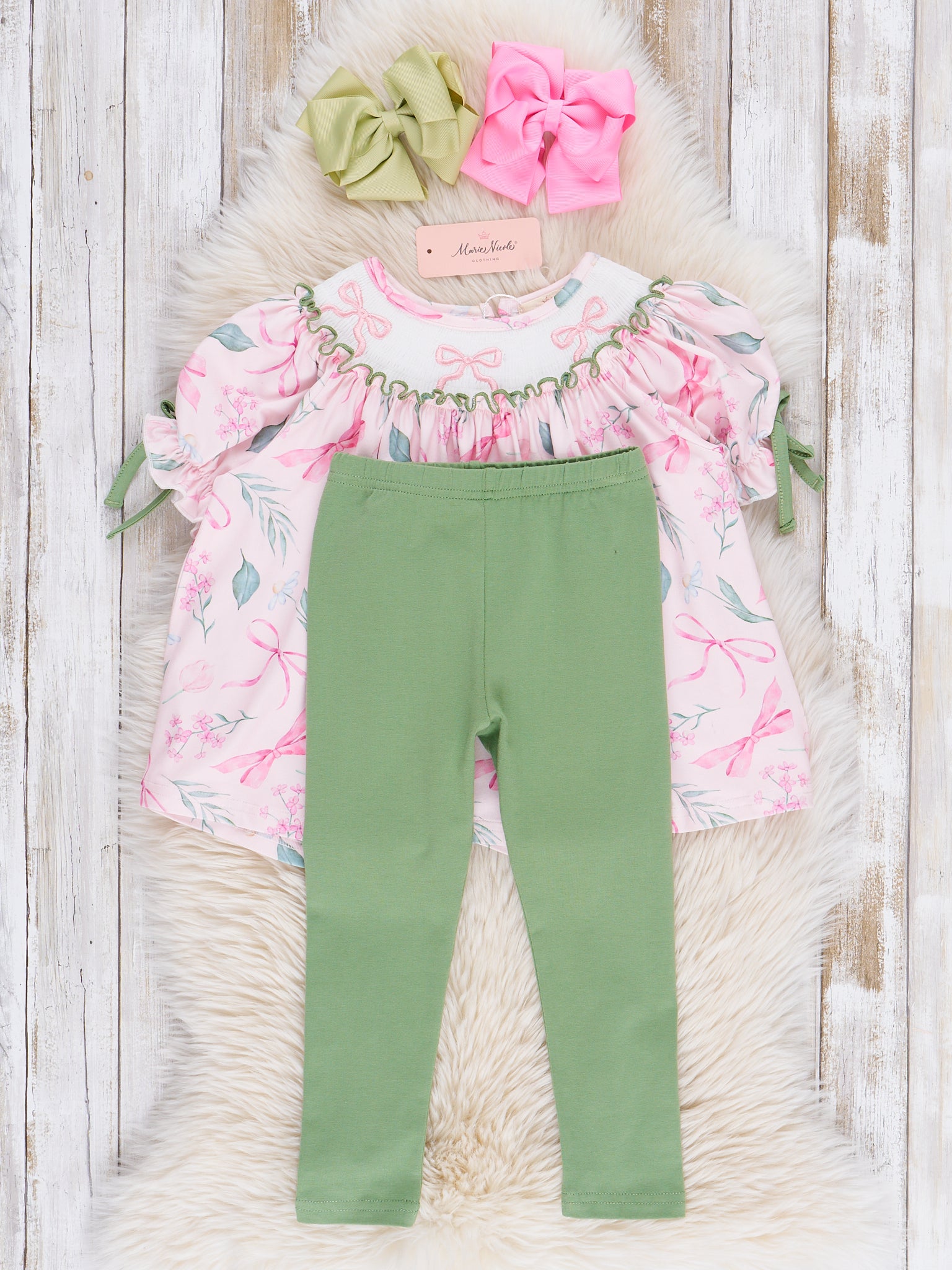 Dress your little one in darling style with our Pink & Green Smocked Bows Outfit! This girls' outfit features a sweet bow pattern on a pink top, along with a smocked neckline and embroidered pink bows. The green bow sleeve detail adds a playful touch that perfectly matches the green leggings. Take a look at the sister set by Marie Nicole Clothing, for triple the cuteness!