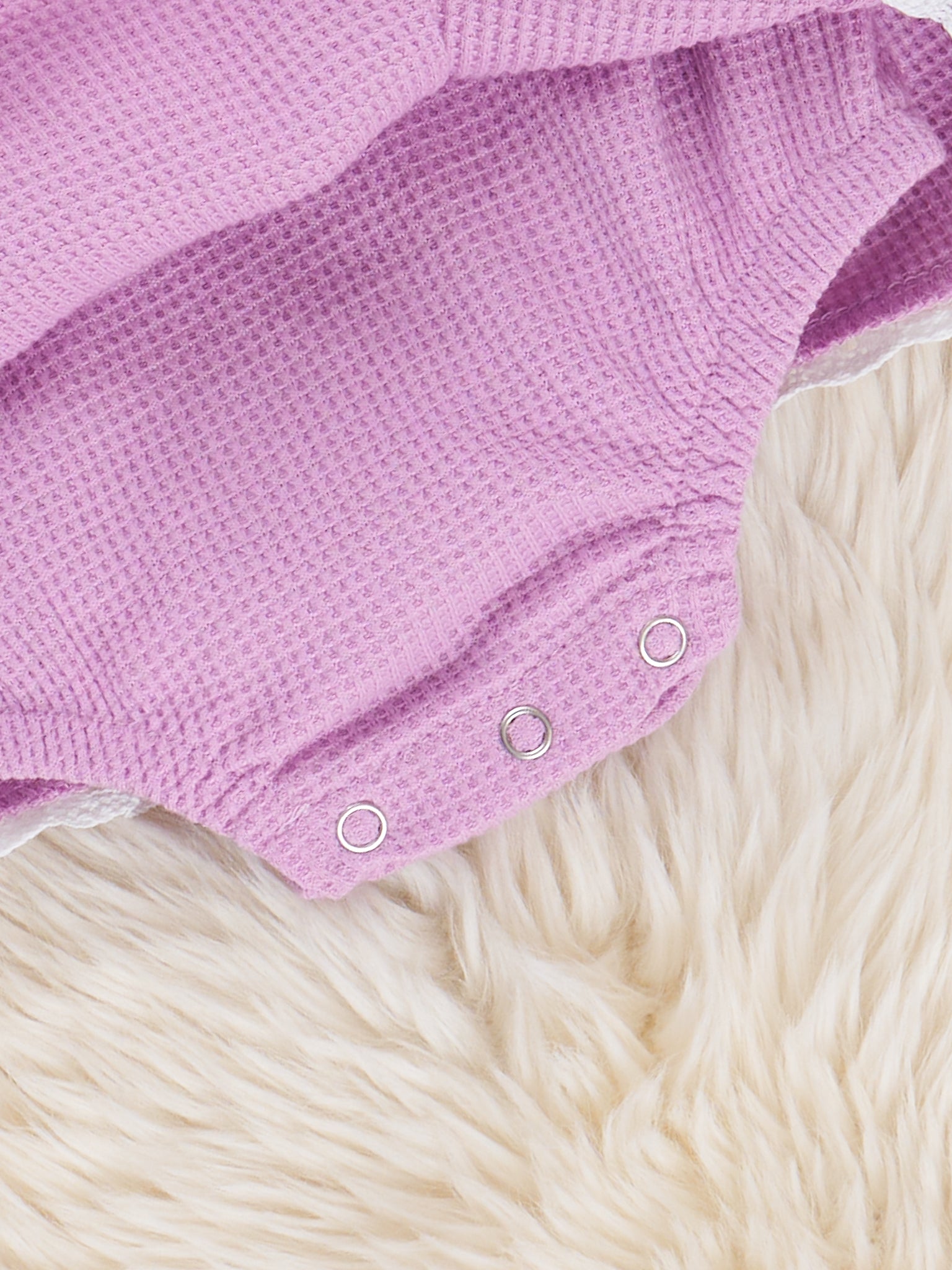 Hop into spring with this adorable Waffle Knit & Lace Bunny Ruffle Bubble! Made from soft lavender waffle knit fabric with delicate lace trim and an embroidered bunny, this girls bubble is perfect for Easter and beyond. Part of the sister set from Marie Nicole Clothing.