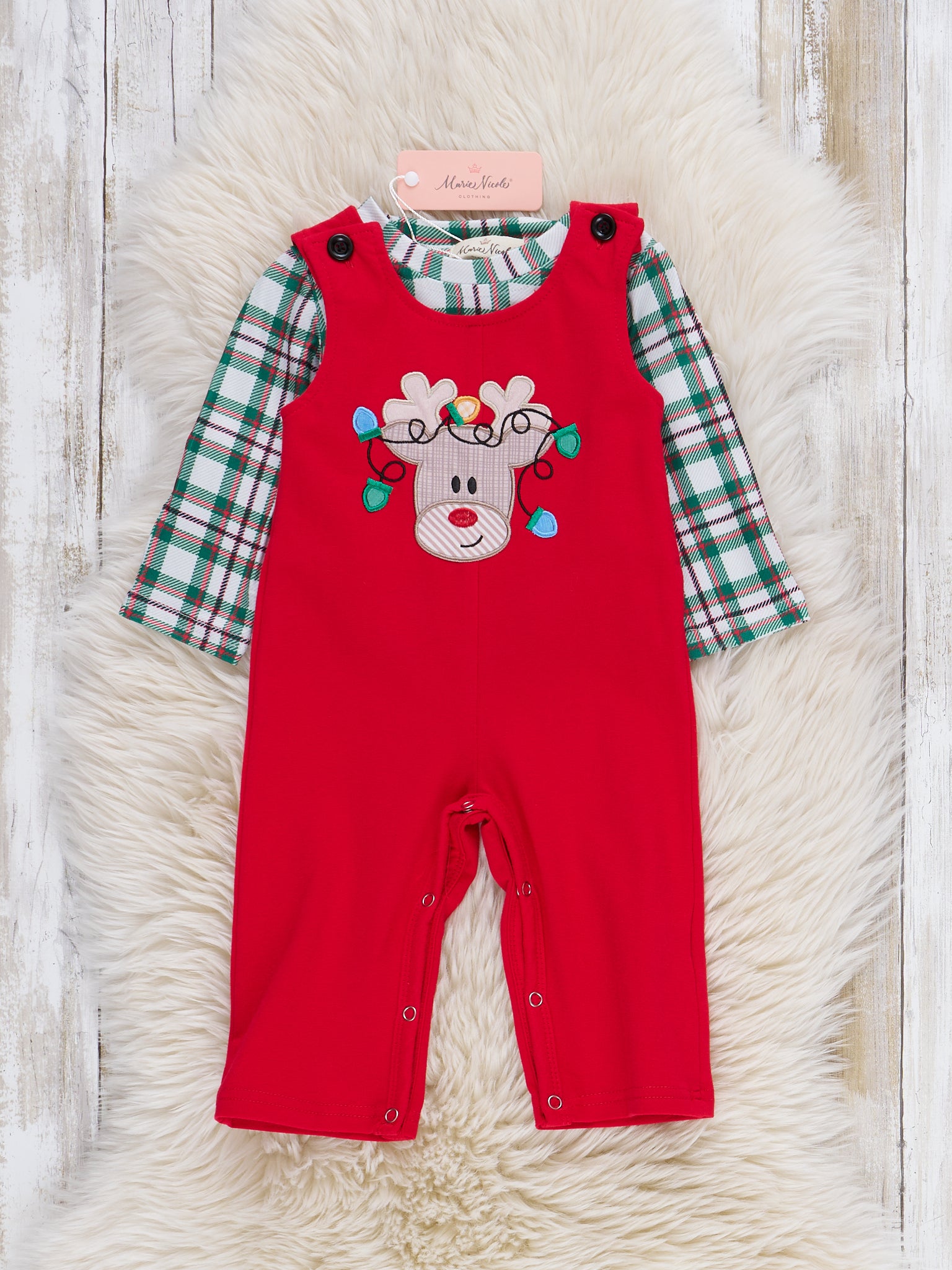 Keep the holidays bright with the Reindeer Lights Embroidered Overall Romper Set! Colorful Christmas lights adorn Rudolph on this red overall, paired with a plaid, long-sleeve underneath. This two-piece set from Marie Nicole Clothing is so cheerful and festive. Made with soft, comfy fabric, your little boy will love wearing this during the winter holidays!