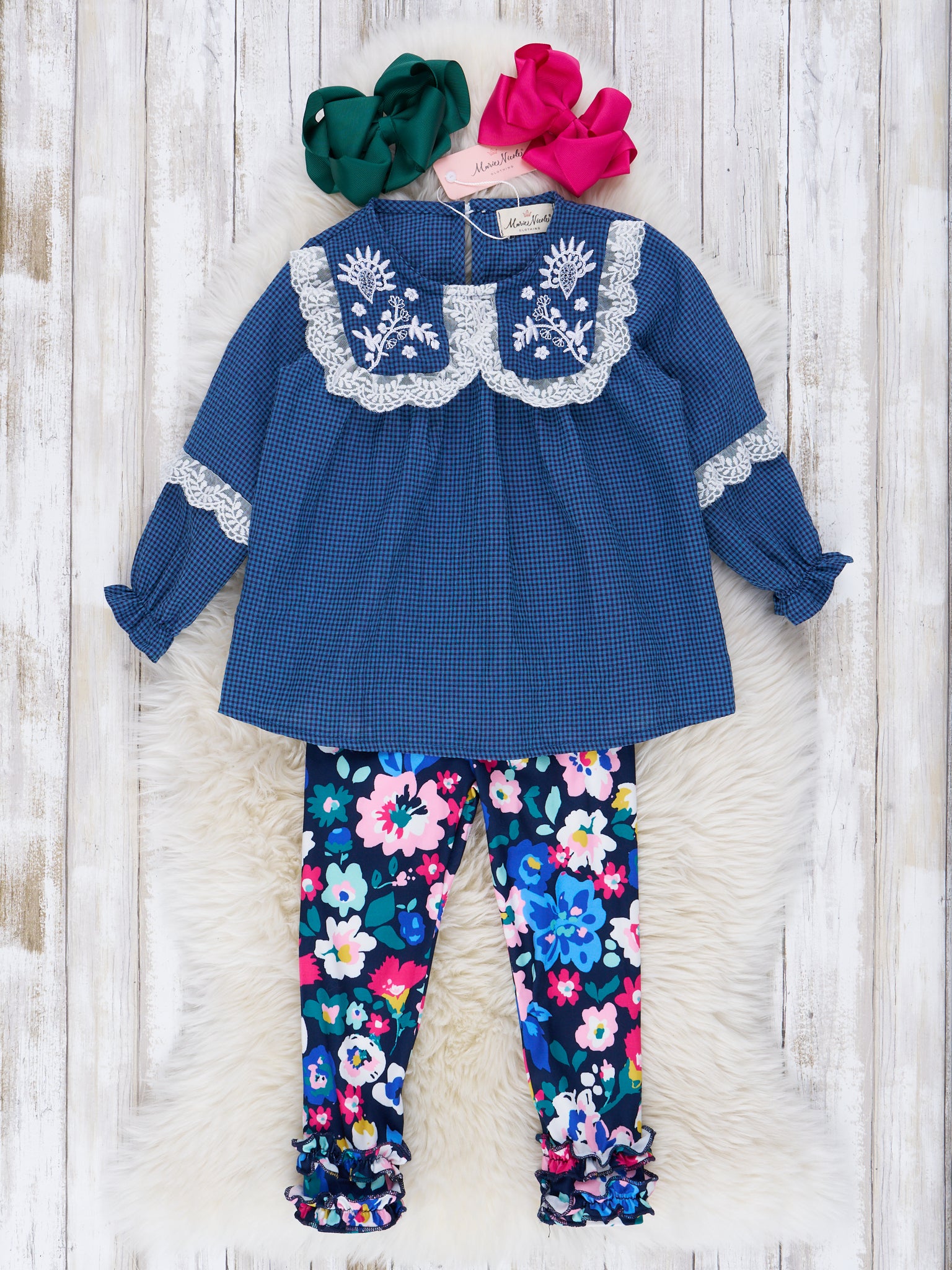 Chambray Embroidered Watercolor Floral Ruffle Outfit