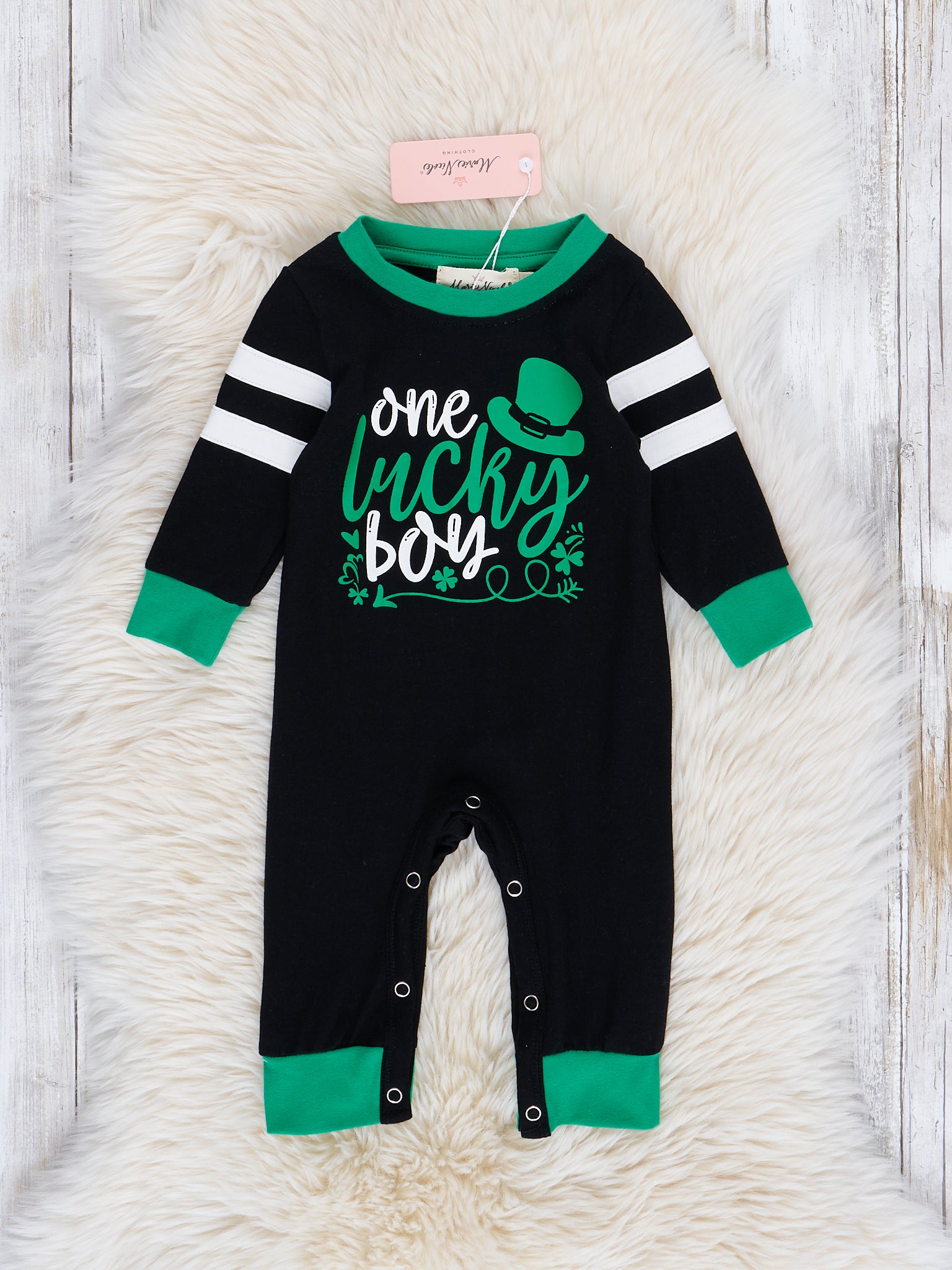 Let your little one show off his luck with this charming black "Lucky Boy" romper! This brother set comes with classic rugby stripes and lively green trim, perfect for celebrating St. Patrick's Day in style. Get him ready for a good time – don't be caught without this lucky number!