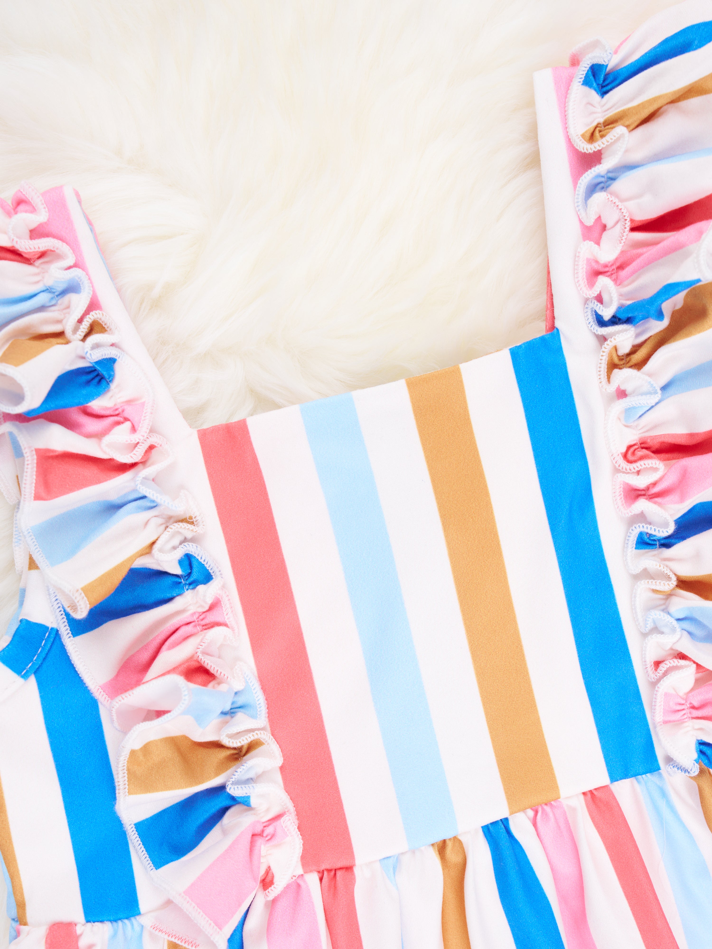 Fashionable Flutter Fun! Your little fashionista will be the talk of the playground in this Bright Striped Ruffle Dress. Featuring vibrant stripes and cheerful flutter sleeves, this dress is the perfect way to bring a little sparkle and pizzazz to any day!