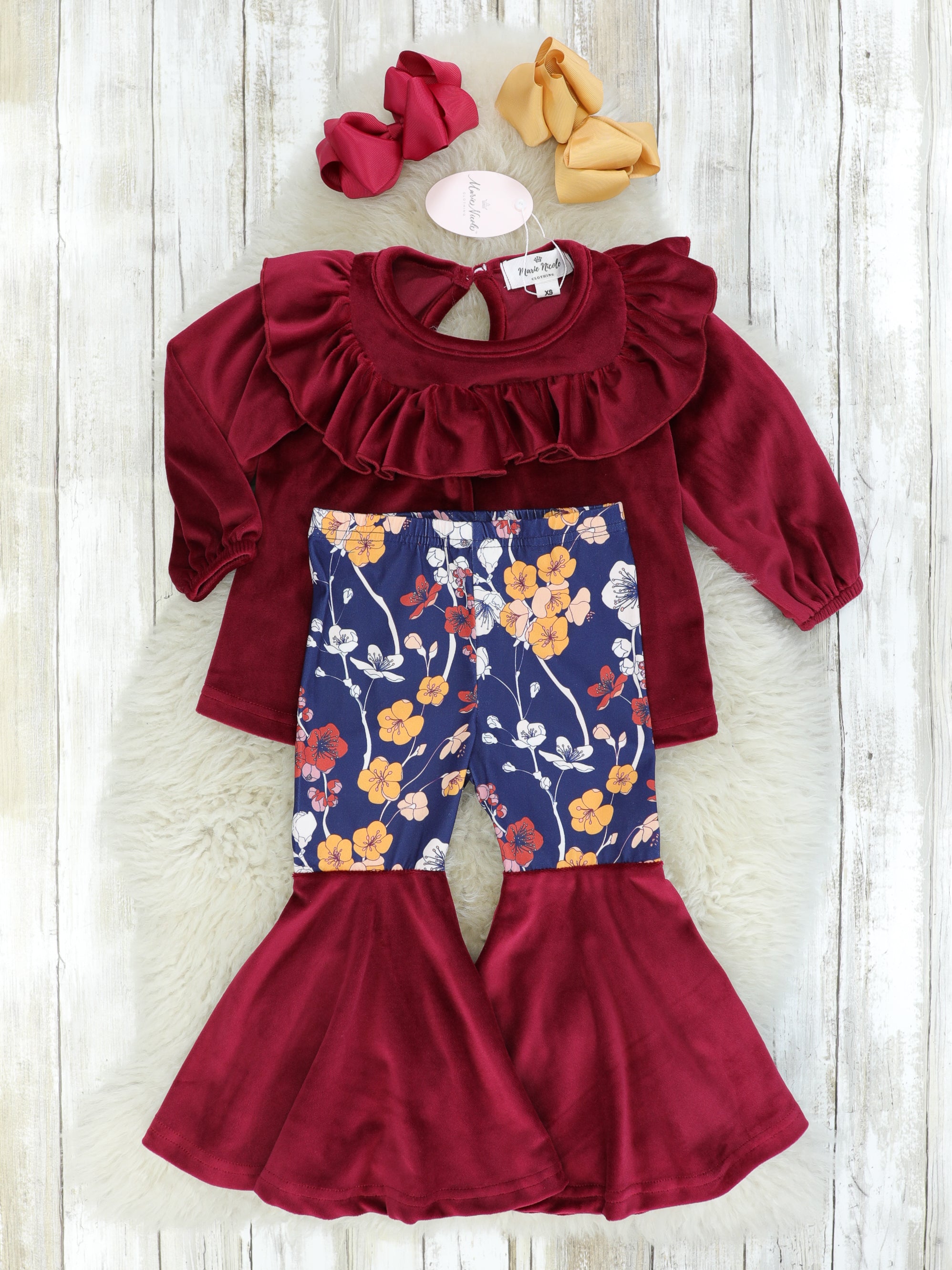 Burgundy Velvet Ruffle Top & Navy Floral Bell Bottoms Outfit
