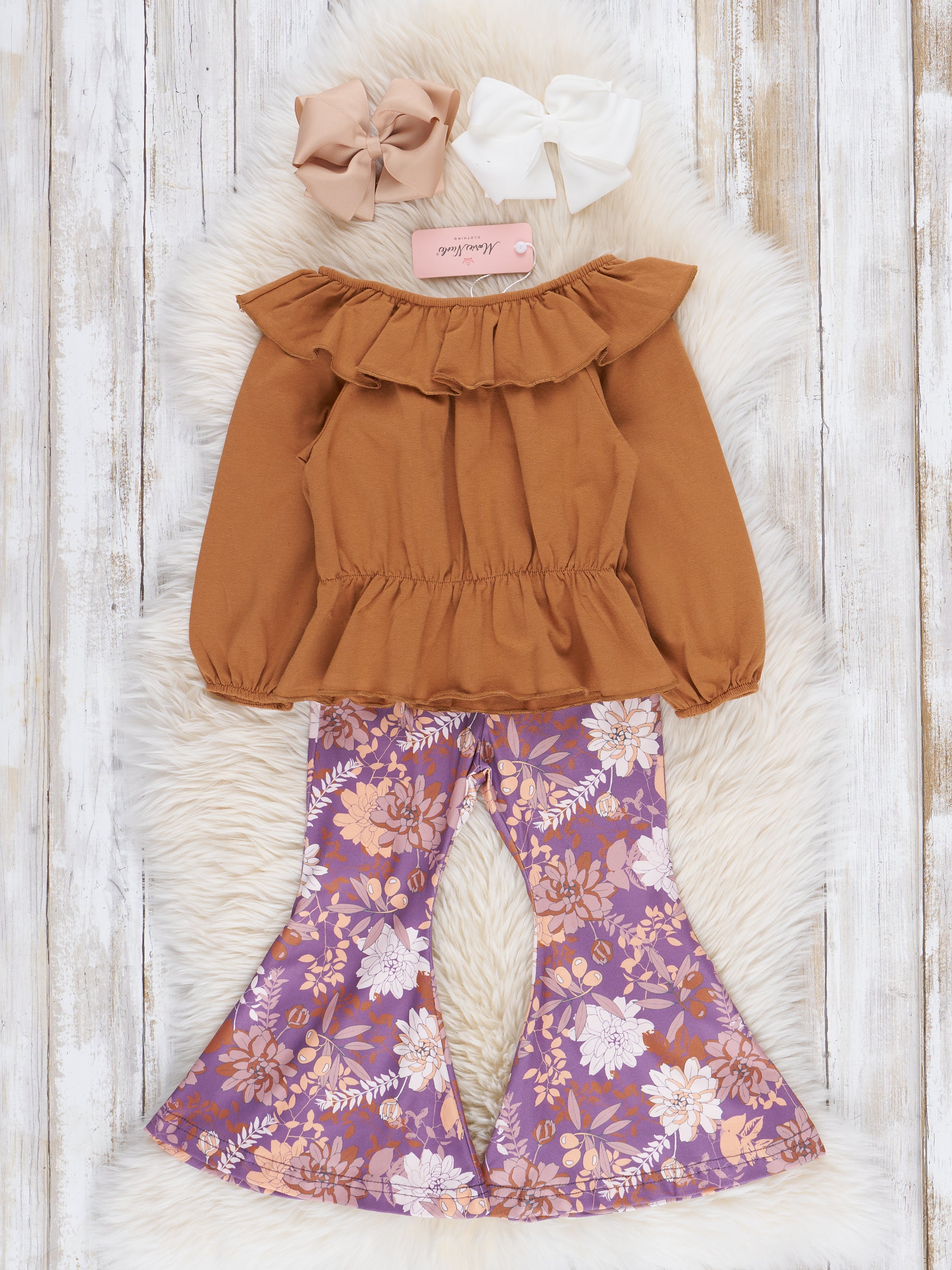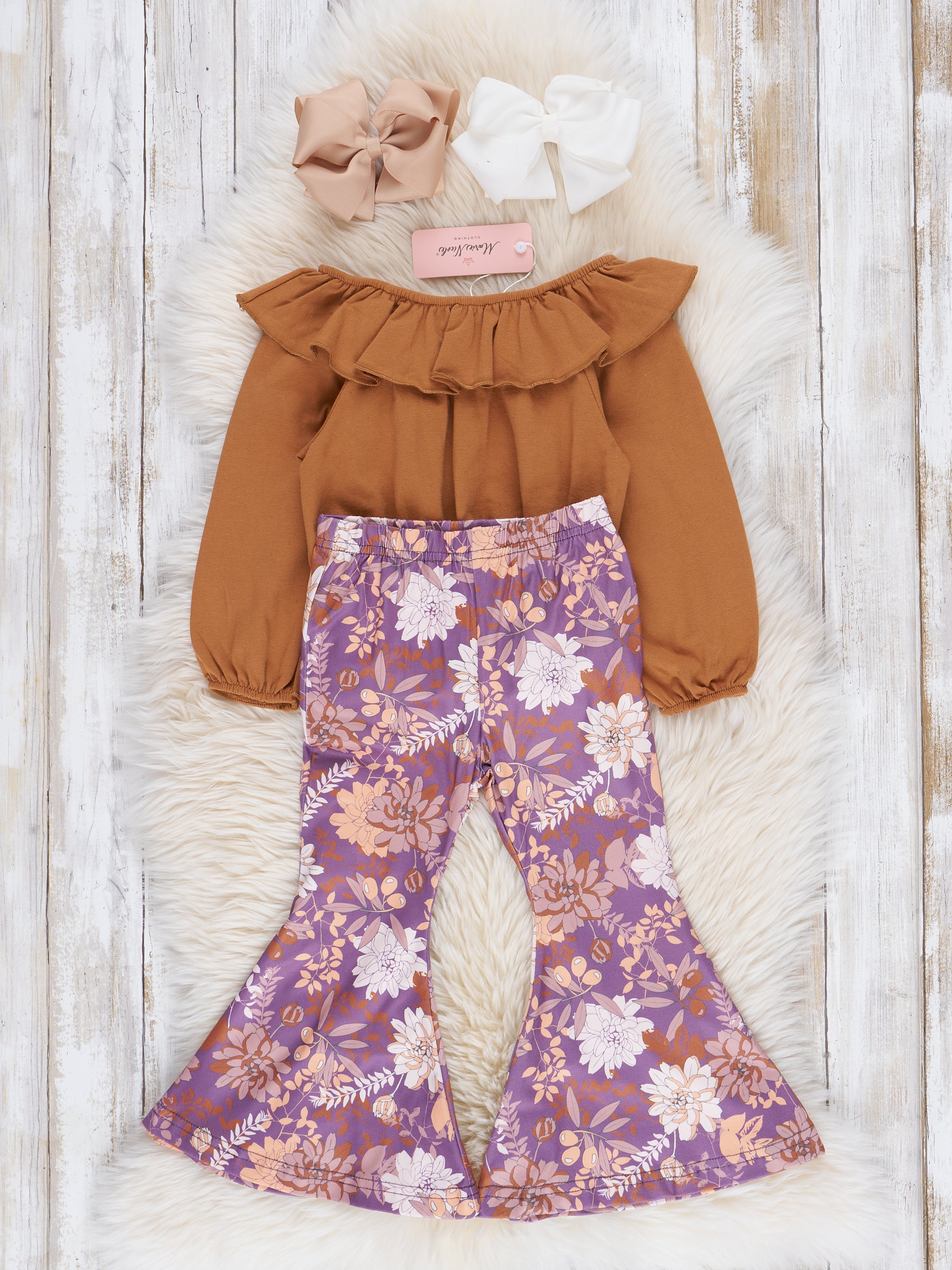 Gear up for an autumn adventure with our Camel Wildflowers Bell Bottoms Outfit! This playful girls' ensemble features a charming camel ruffle top and eye-catching purple wildflower print bell bottoms. Perfect for your little one who loves to stand out from the crowd. Fits true to size.
