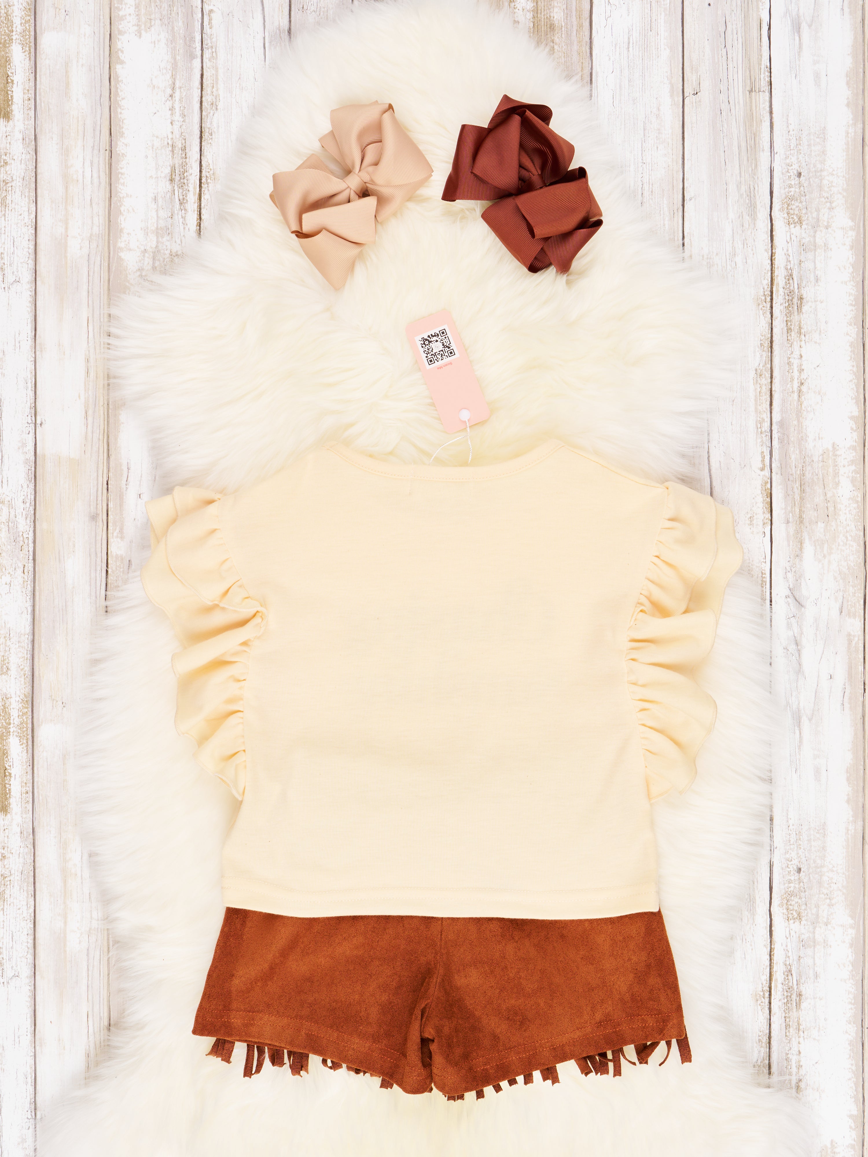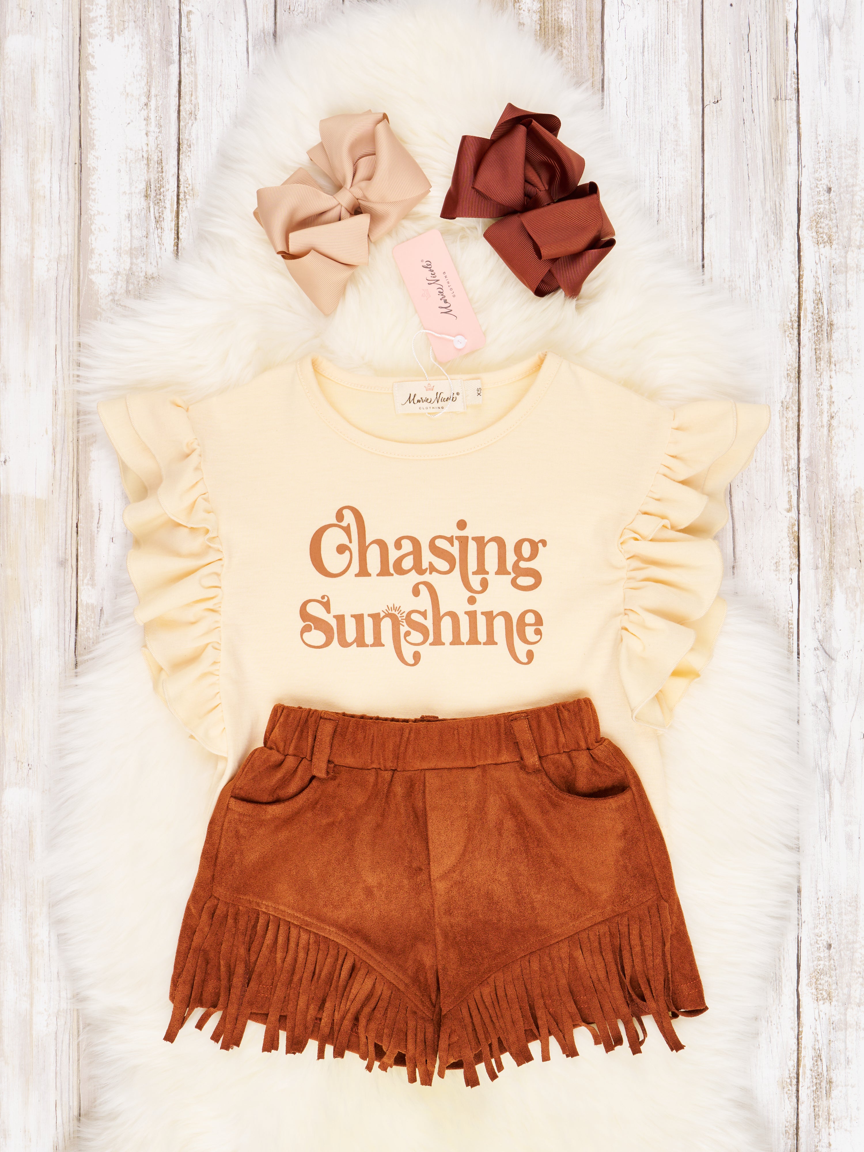 Let their wild imaginations run free with this "Chasing Sunshine" Fringe Outfit! With ruffle sleeves and suede shorts with a hint of fringe, this outfit is made for exploring the world and all the adventures it can bring. Plus, the elastic waistband will keep them comfortable for hours of sunshine-chasing fun!