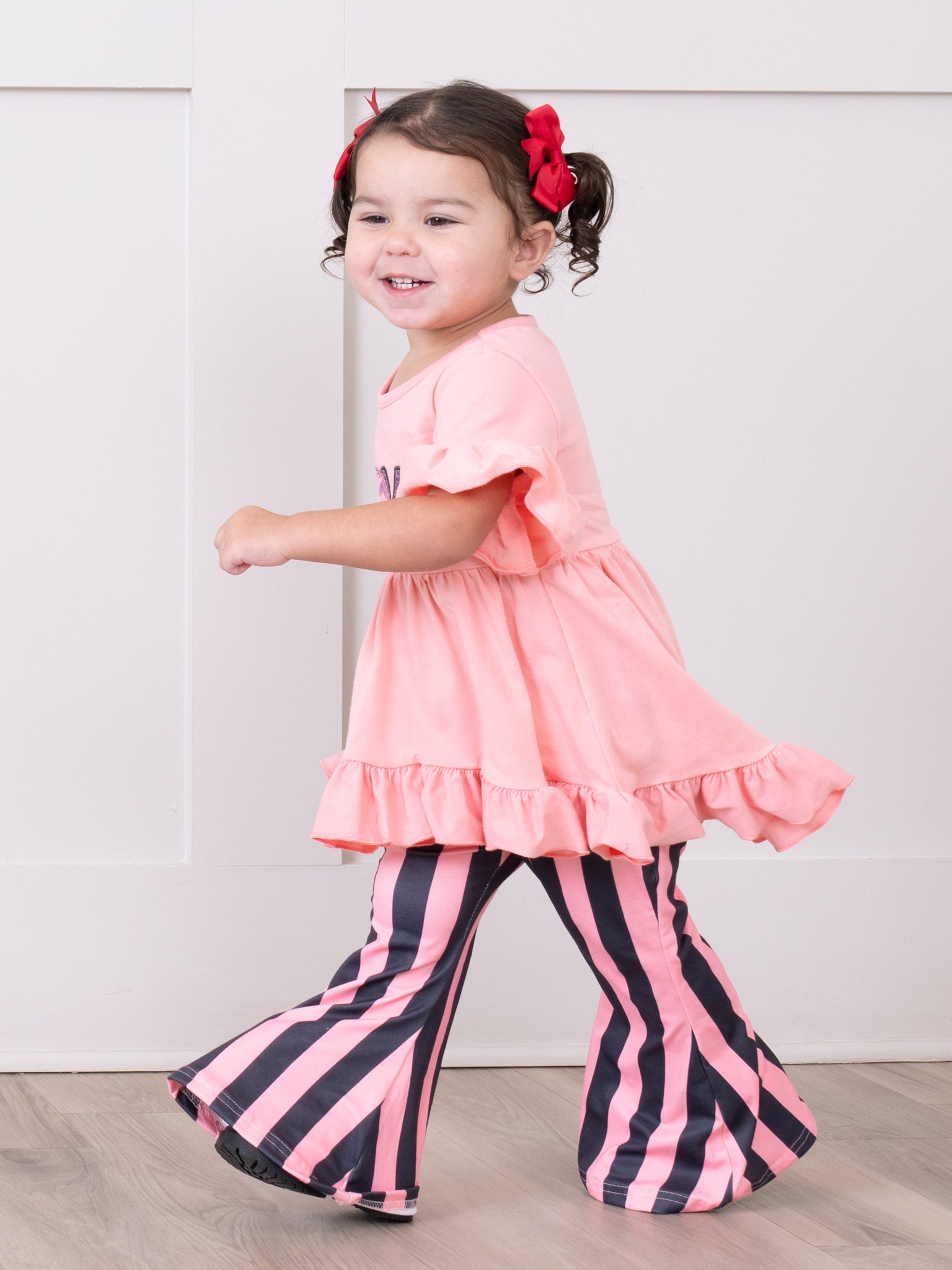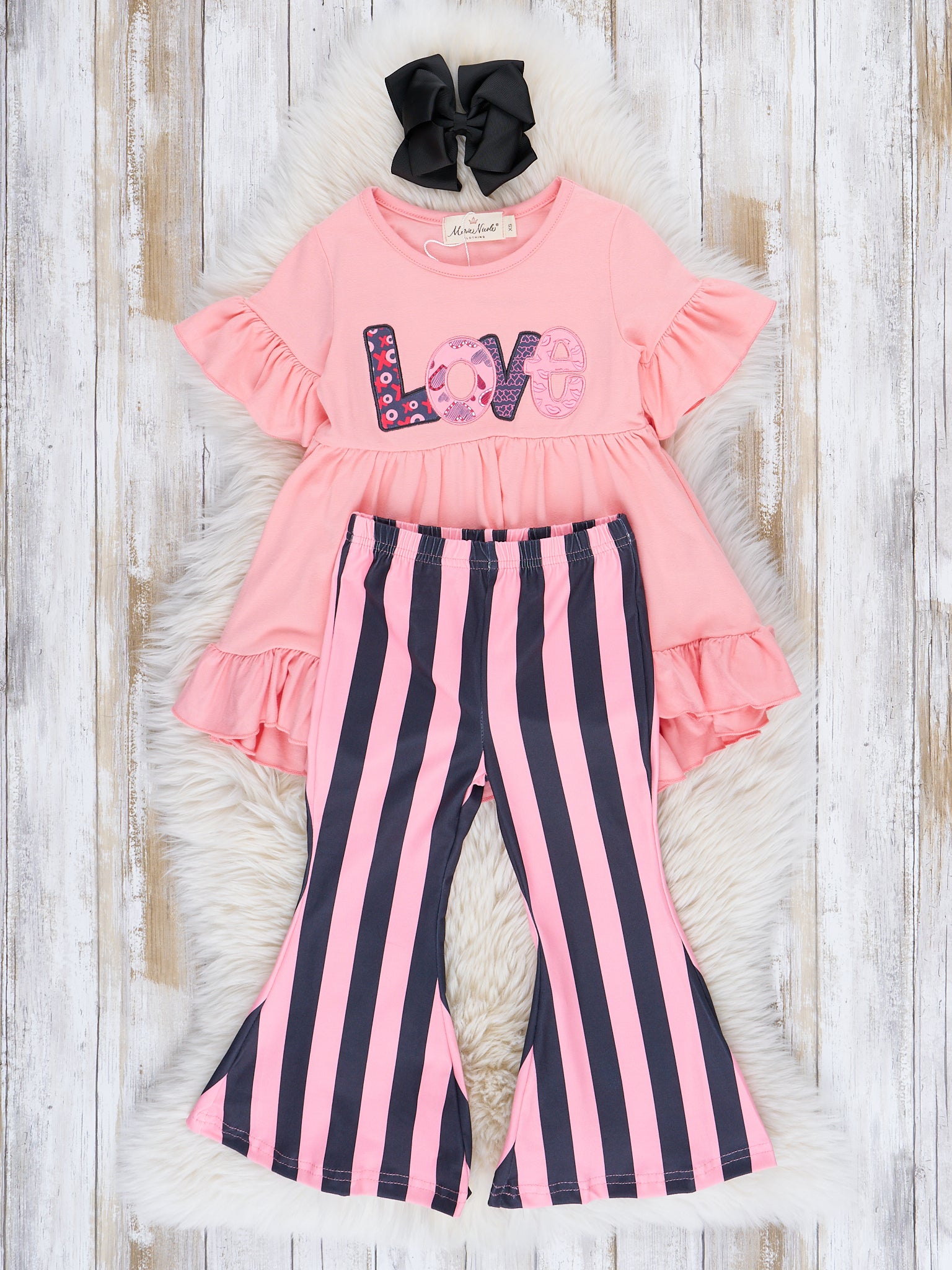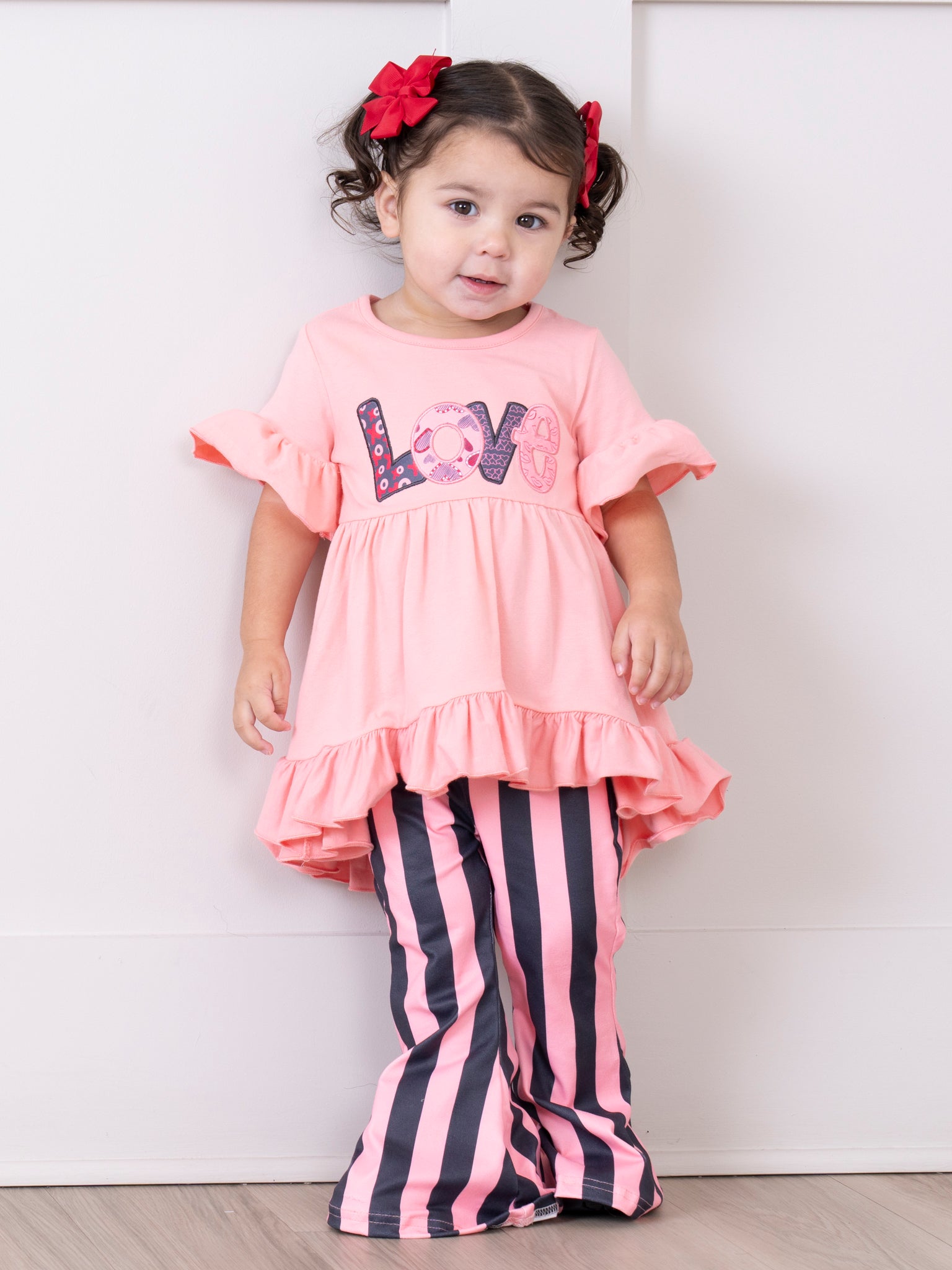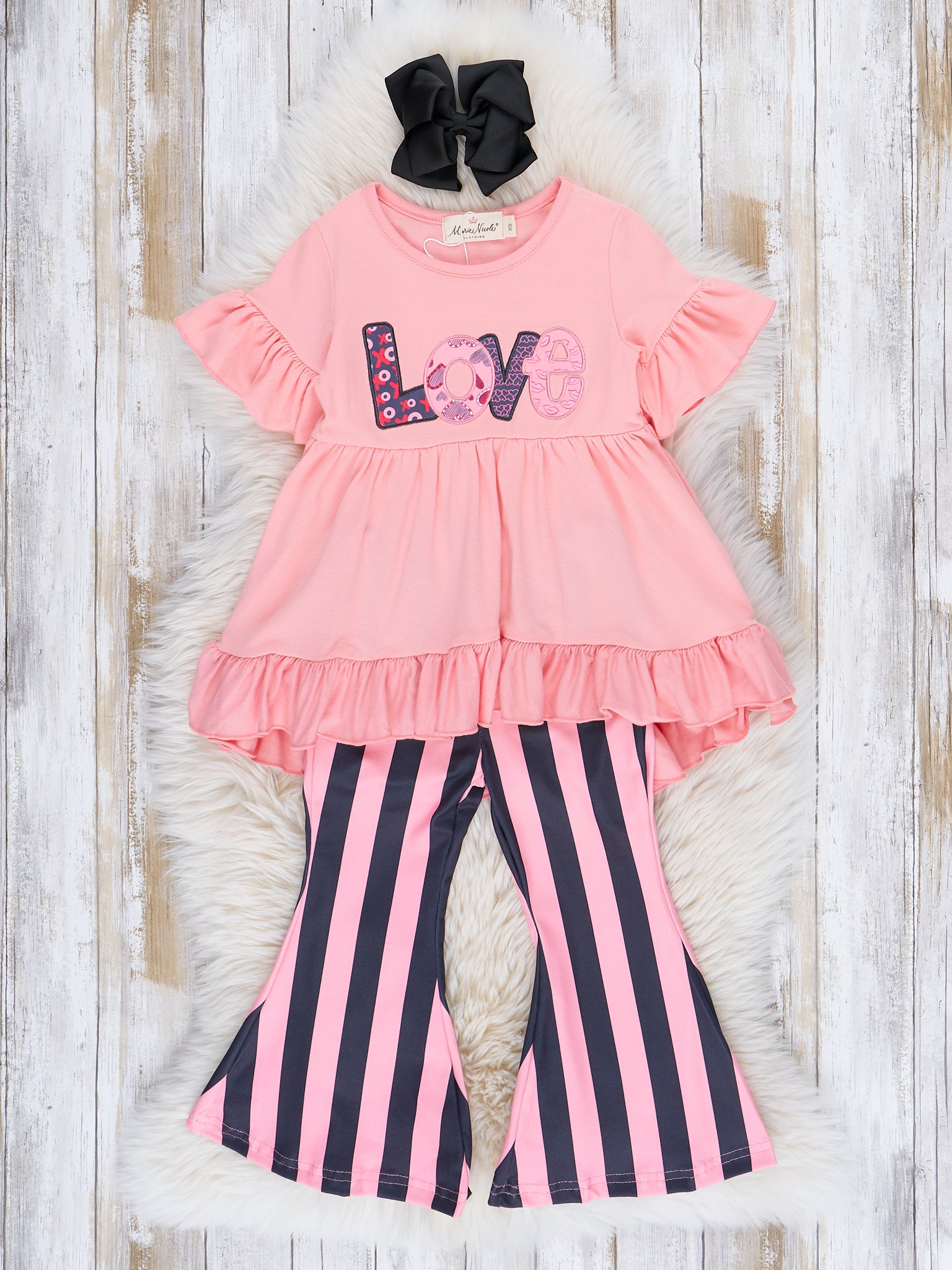 This Coral Stripes "Love" Bell Bottom Outfit is the perfect way to show your love in style! Its ruffle hi-low top and cute coral and black striped bell bottoms will leave your little one feeling oh-so-adorable. It's the only outfit worthy of an A+ in fashion!