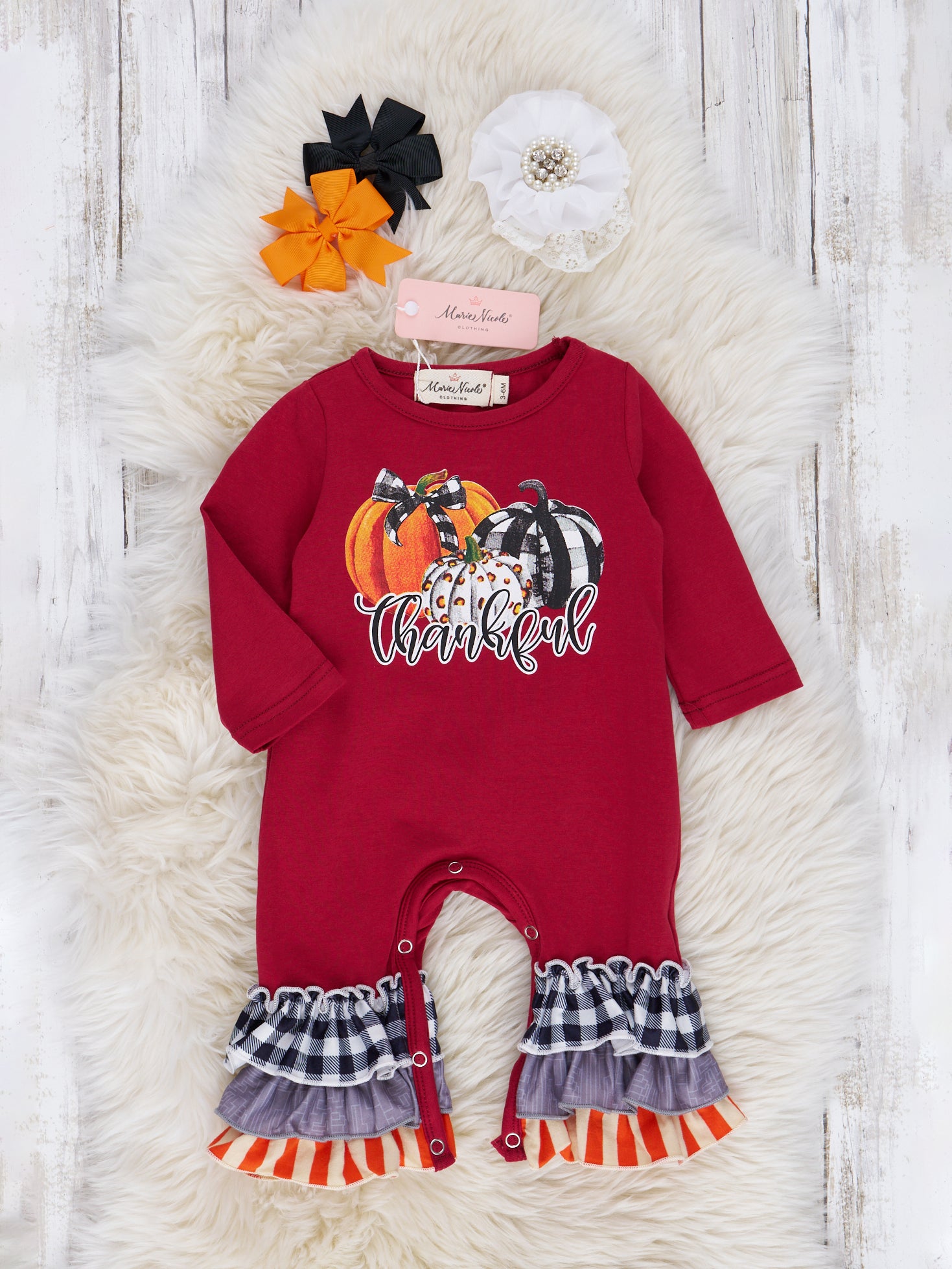 Crimson Gingham & Stripe "Thankful" Ruffle Romper