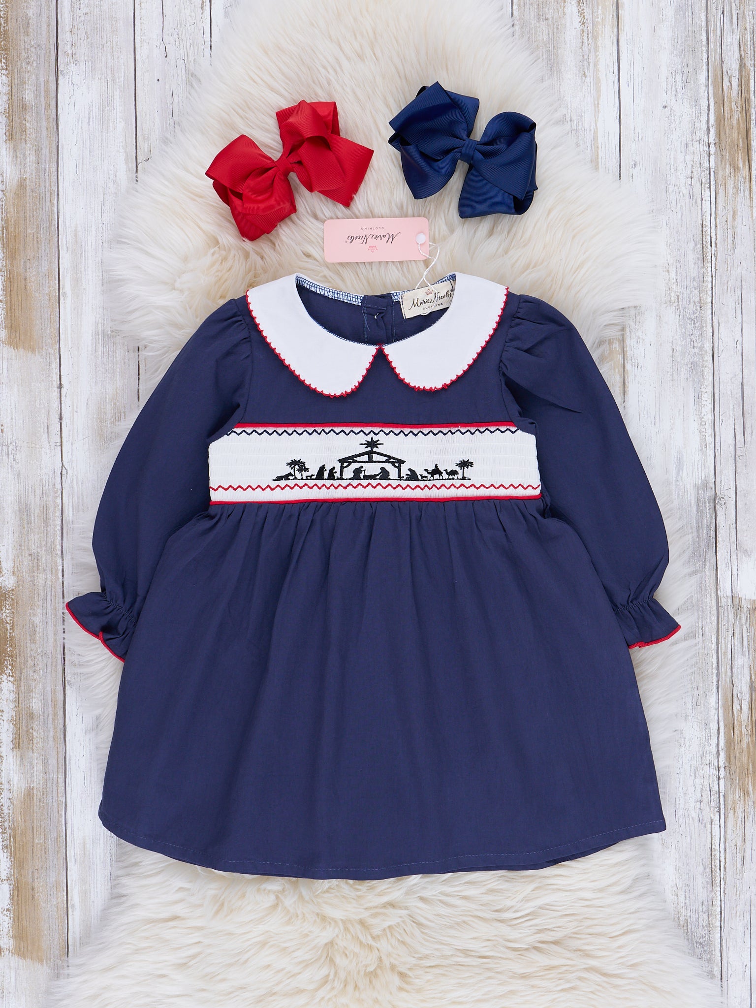 This sister set is a beautiful connection to the nativity story with its deep blue hues and intricate smocked design. Ideal for holiday gatherings, church celebrations, or creating cherished memories during this festive time. Get ready for a season of grace and style with our Deep Blue Smocked Nativity Dress! ๐๐๐